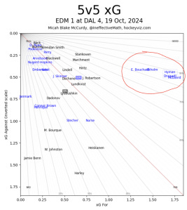 Jamie Benn also had a good game Saturday, I thought. DeBoer made sure to mention Benn’s hit(s) on Leon Draisaitl in the second period (which came after a decent hit by Brendan Smith, too), and Benn also had a good block late in the first against the top Oiler forwards. Benn was the only forward to win more than half of his faceoffs, too. Leadership isn’t always loud (unless you’re on the receiving end of it).