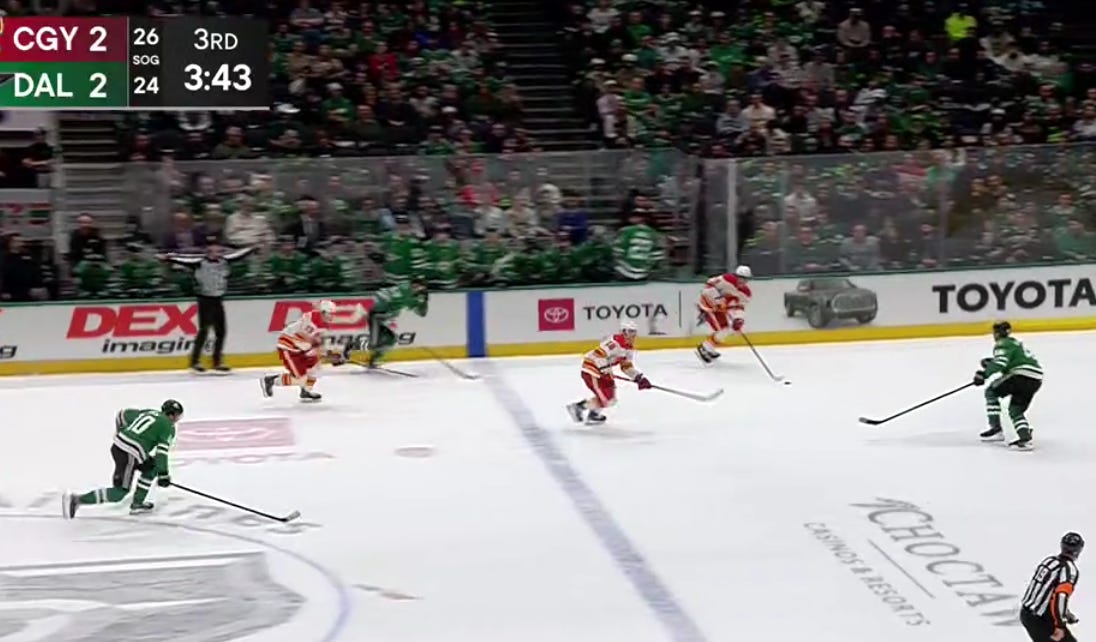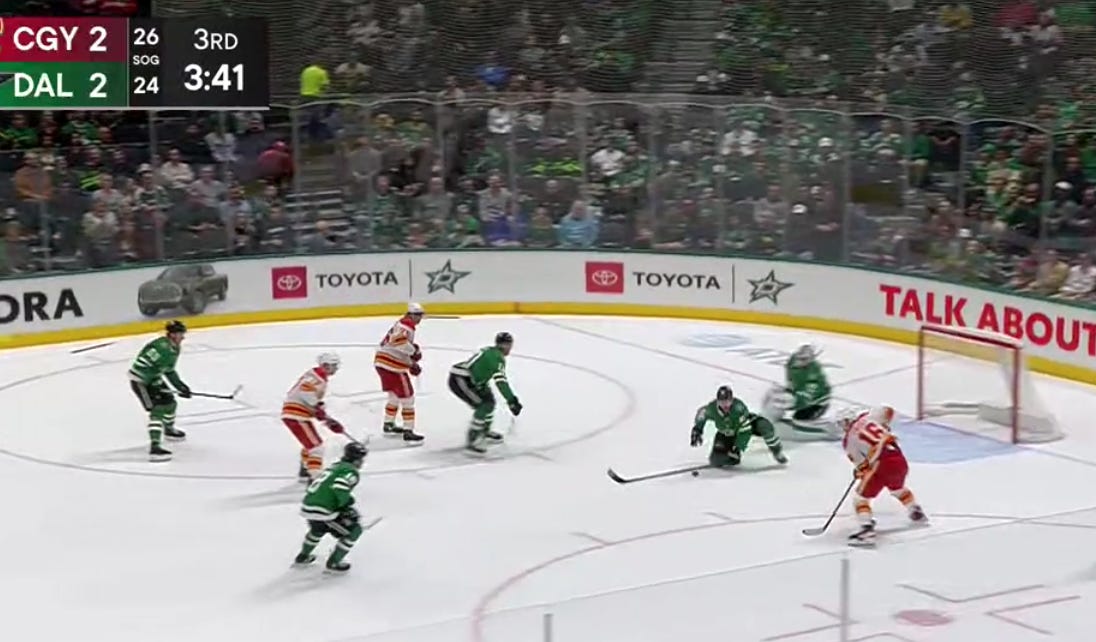 Matt Dumba hit a post early in the third off some Stars pressure that mounted as the period went on. Calgary racked up a few icings in the first five minutes as shots on goal grew to 6-0 through the first eight minutes of the period. Calgary was preparing to park the bus, and Dallas had to prove they could cut the brake lines. (Pretend the bus is not filled with people you care about, in this scenario.)