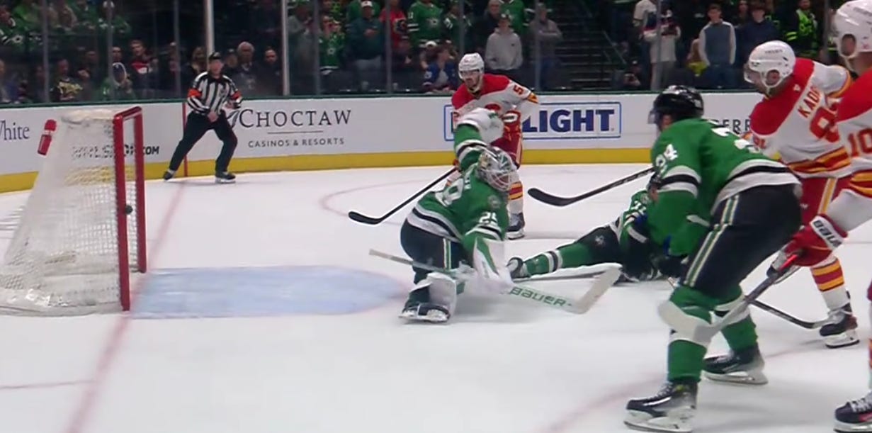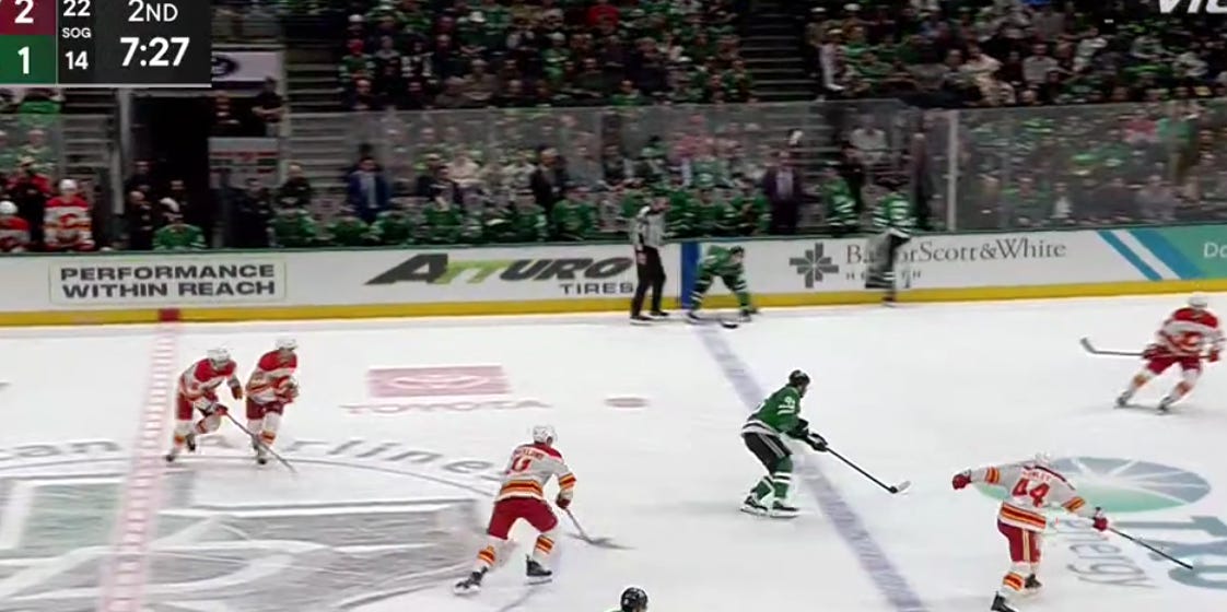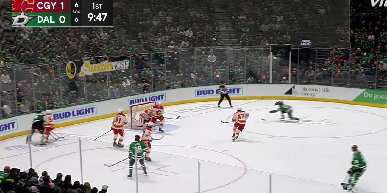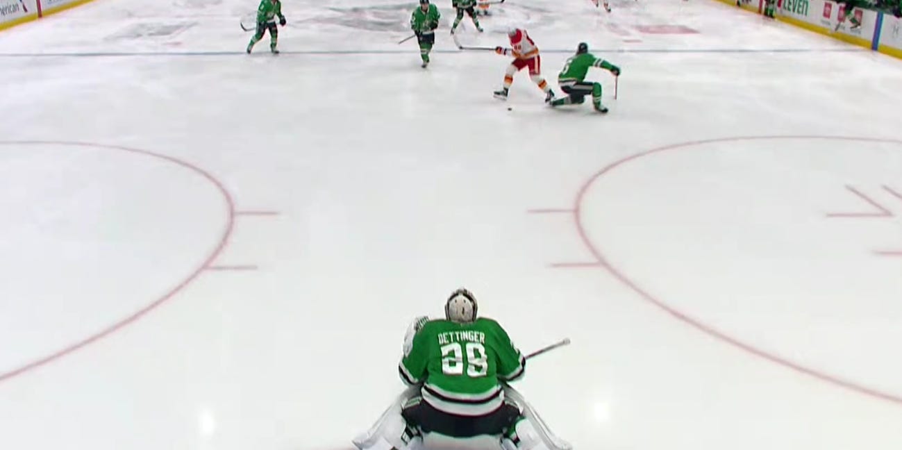 A clutch sweep check from Oettinger saved the Stars’ bacon early, as a long shift for the first trio (Duchene, Harley, Granlund) was turning into trouble after Calgary was able to outchange them. but Oettinger disrupted Calgary’s possession at the most crucial of times, and that gave Dallas a chance to reset.
