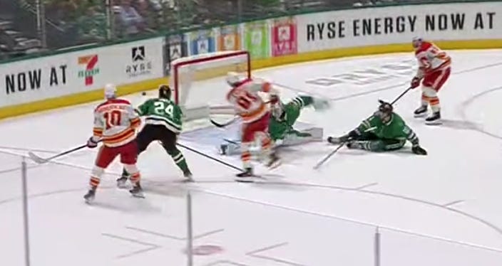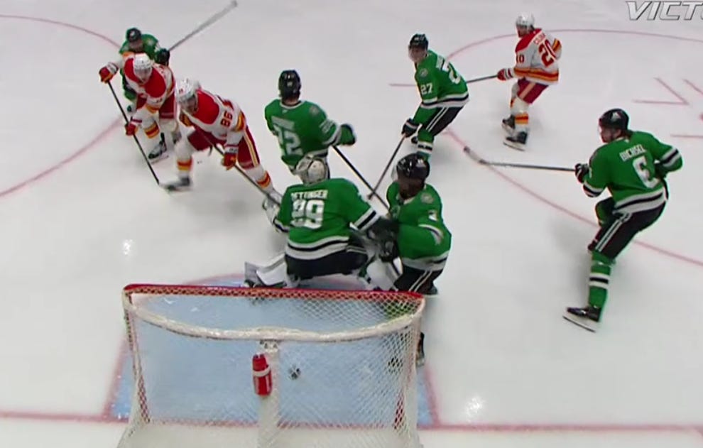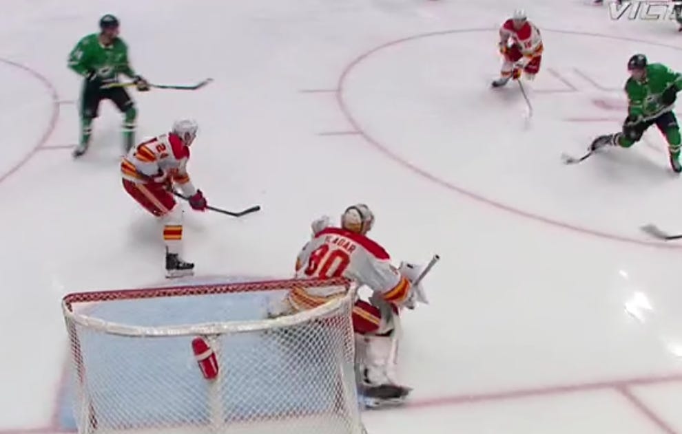 The second period had a similarly ignominious start, as Mikael Backlund scored off a scramble on the doorstep that Dallas just didn’t really defend as desperately as they needed to. The puck eventually slid to Backlund, and probably, you’d like to see Matt Duchene doing just a bit more on the left side of your angle to prevent Backlund from having a free shot here.