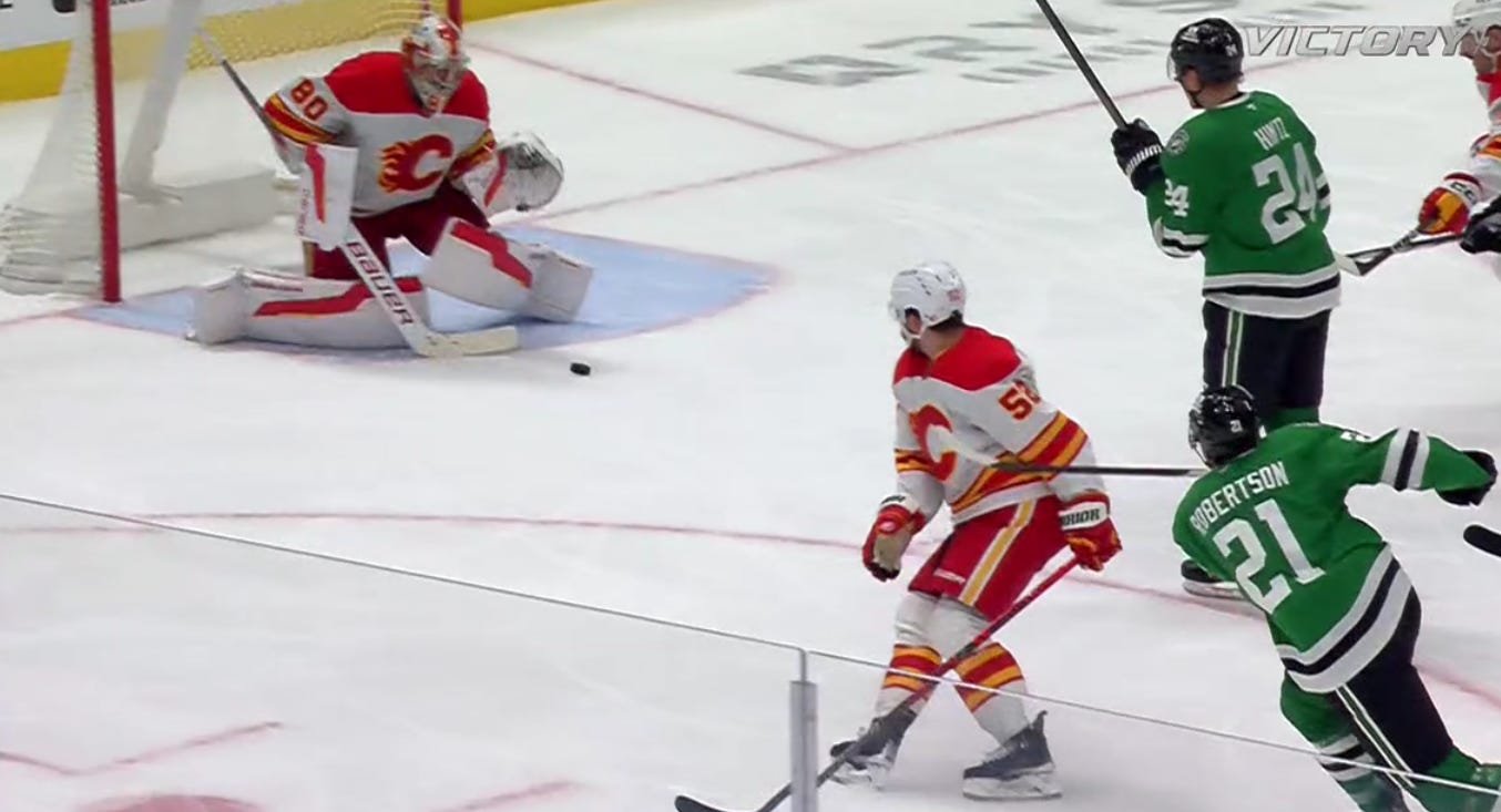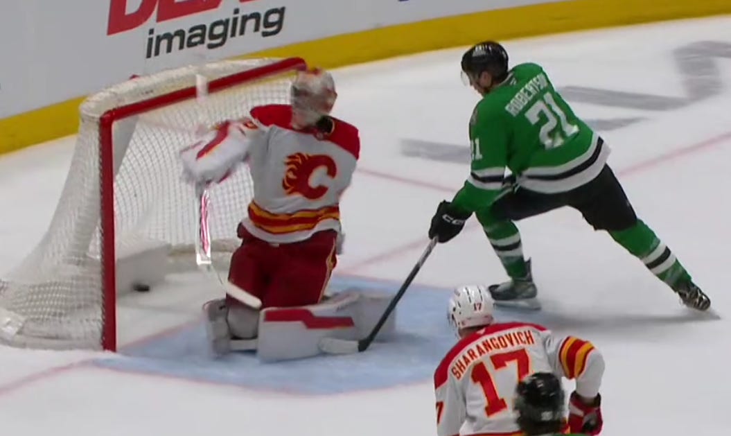 But give them credit: the Flames, complete with old friend Joel Hanley on their second defense pair, forced the Stars to come from behind for most of the night, even jumping out to a 2-0 lead for a glorious minute and a half. Dallas looked tired—Duchene confirmed after the game that a lot of players were running low on energy in this one—and they played tired, with even the fearsome Lian Bichsel getting walked by Joel Farabee for the game’s first goal.