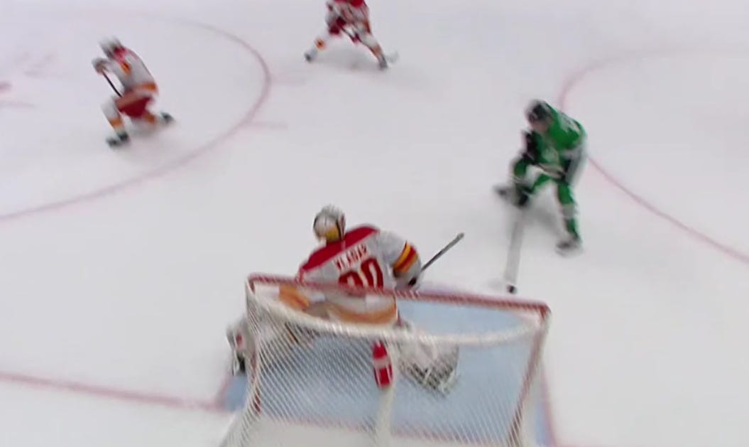Granlund would get his best chance at a goal with Dallas so far courtesy of a fantastic shift by the fourth line, who hemmed the Flames’ own fourth line in the Calgary zone for two minutes, outchanging them in the process. But Robertson’s perfect cross to Granlund here was one-timed just wide of the net: