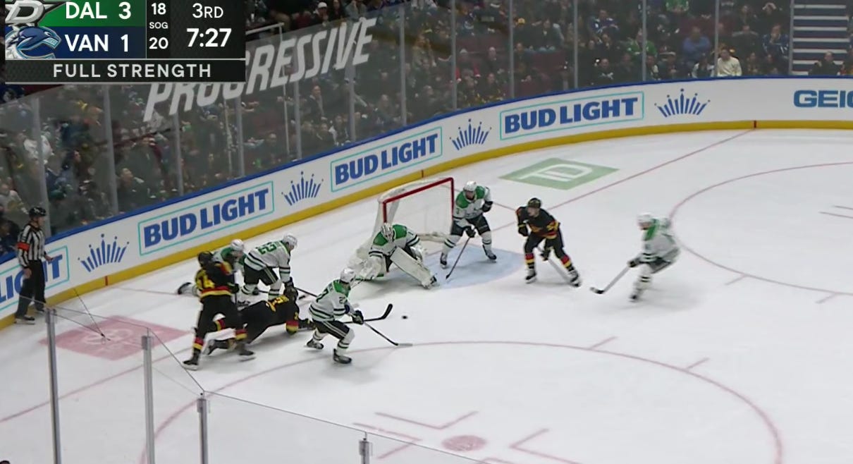 It’s not easy being 6’ 8”, I hear. But it is apparently even more difficult to be the Dallas Stars Power Play in Vancouver, because they spent a fourth set of two minutes with nothing much generated, and one scrambly sequence allowed at the other end, but again without result.