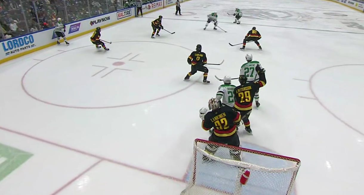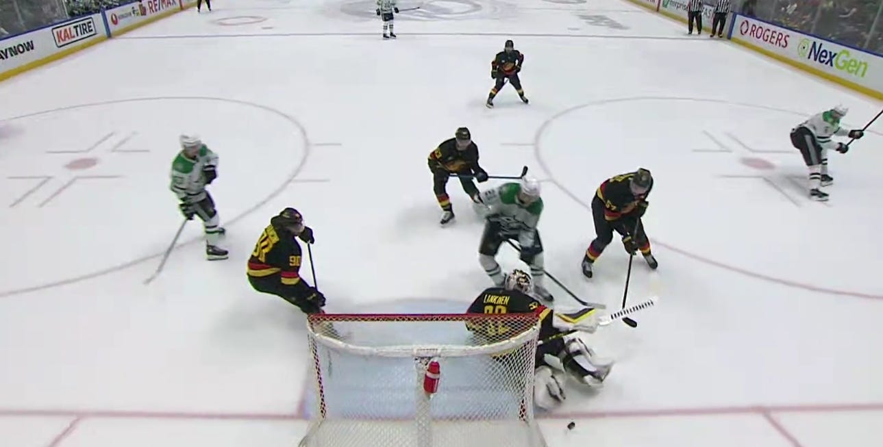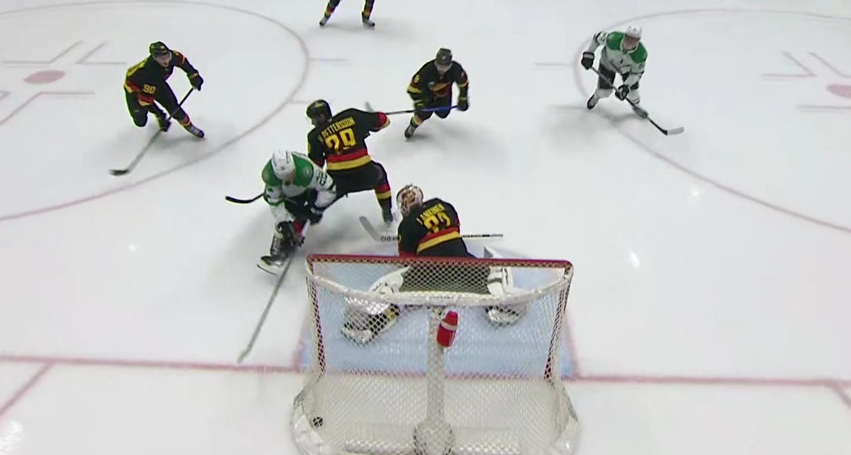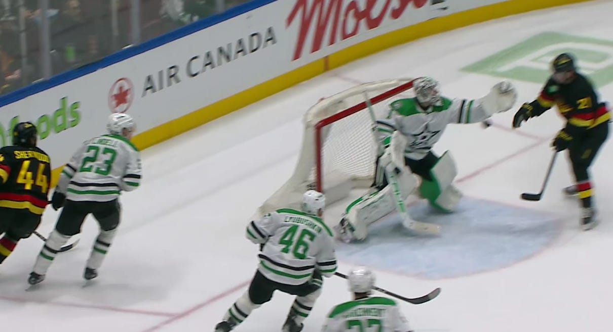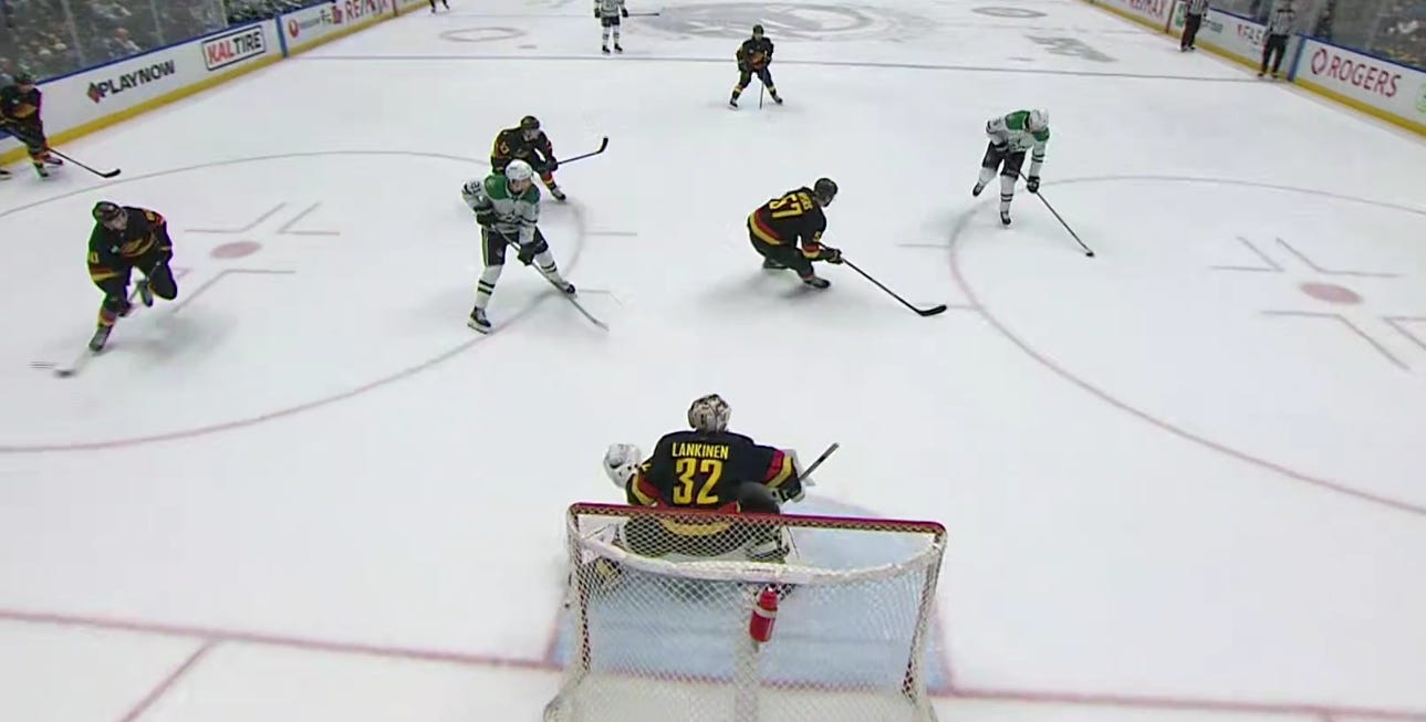 A scramble at the netfront indicated Vancouver’s pushback, and the Stars had to hunker down for a couple of minutes to weather the storm. They ended up generating a chance of their own just after the halfway mark, as Rantanen fed Robertson from the boards with Lian Bichsel rushing in alongside him. Robertson set up the defenseman for a great shot that got through Lankinen, but the puck trickled just wide of the post and behind the goal line.