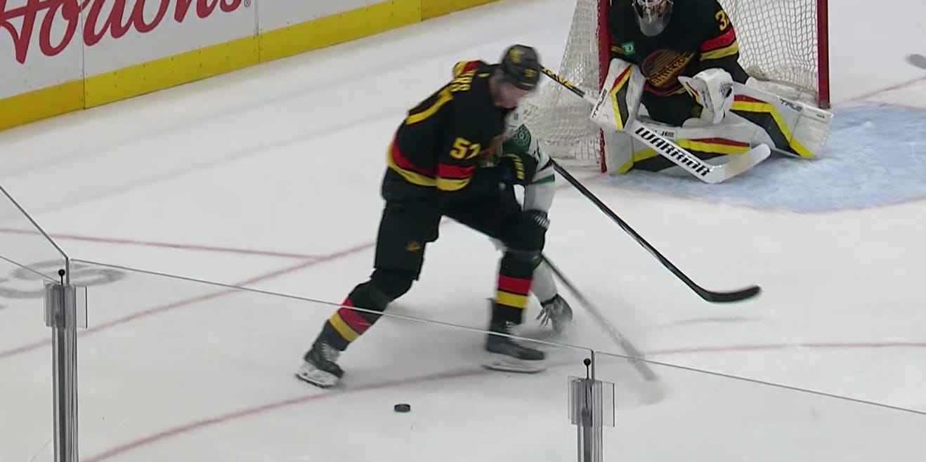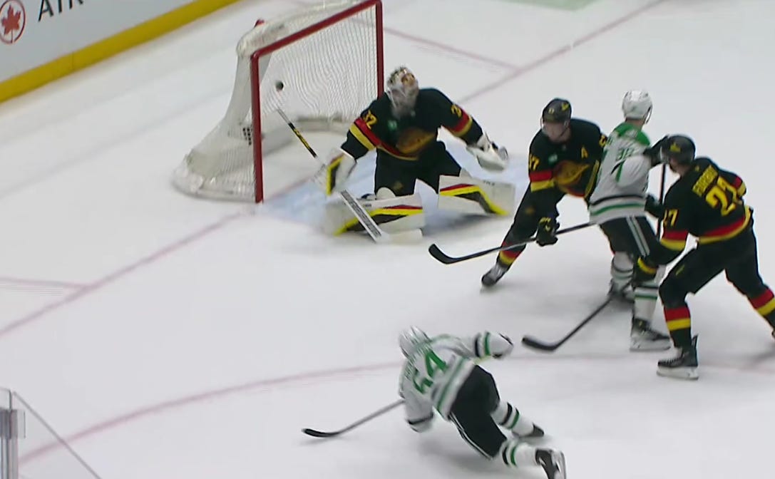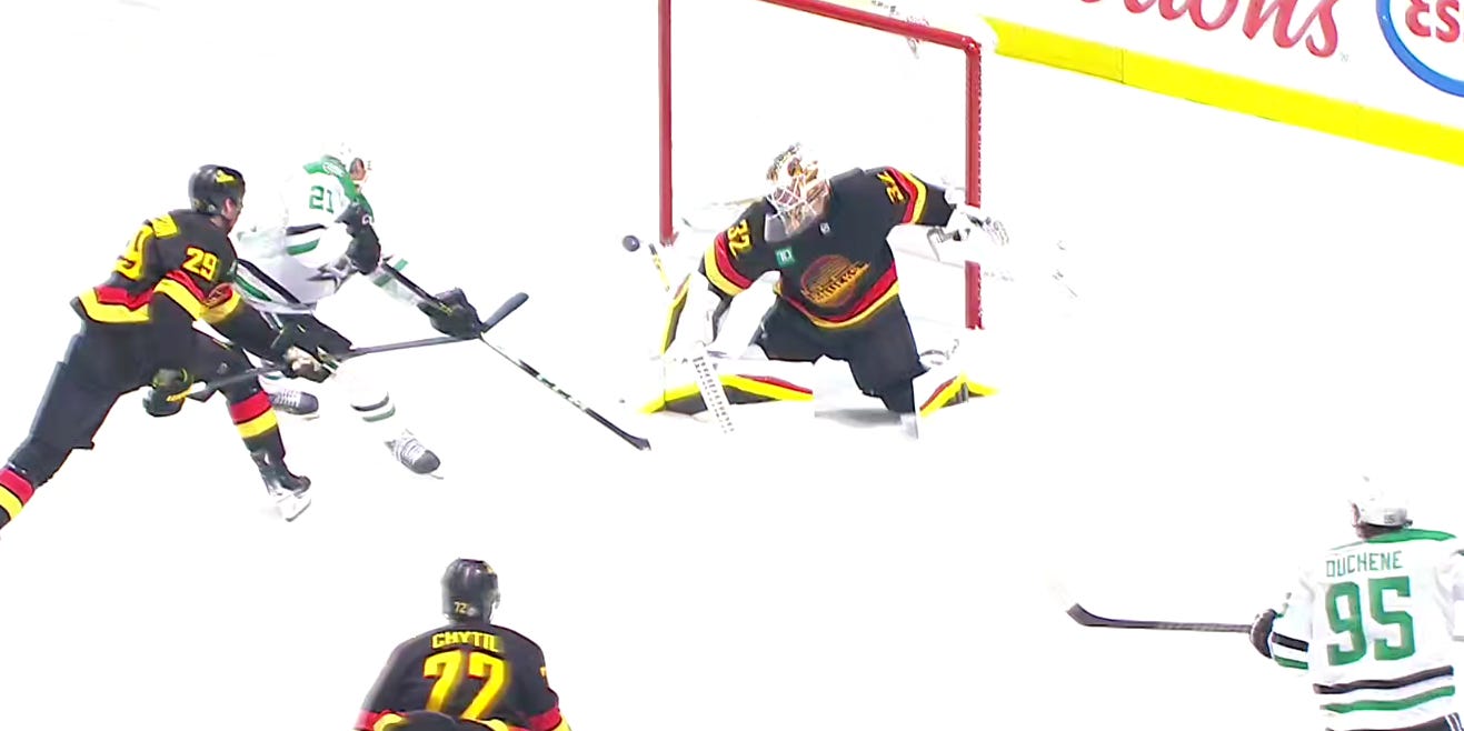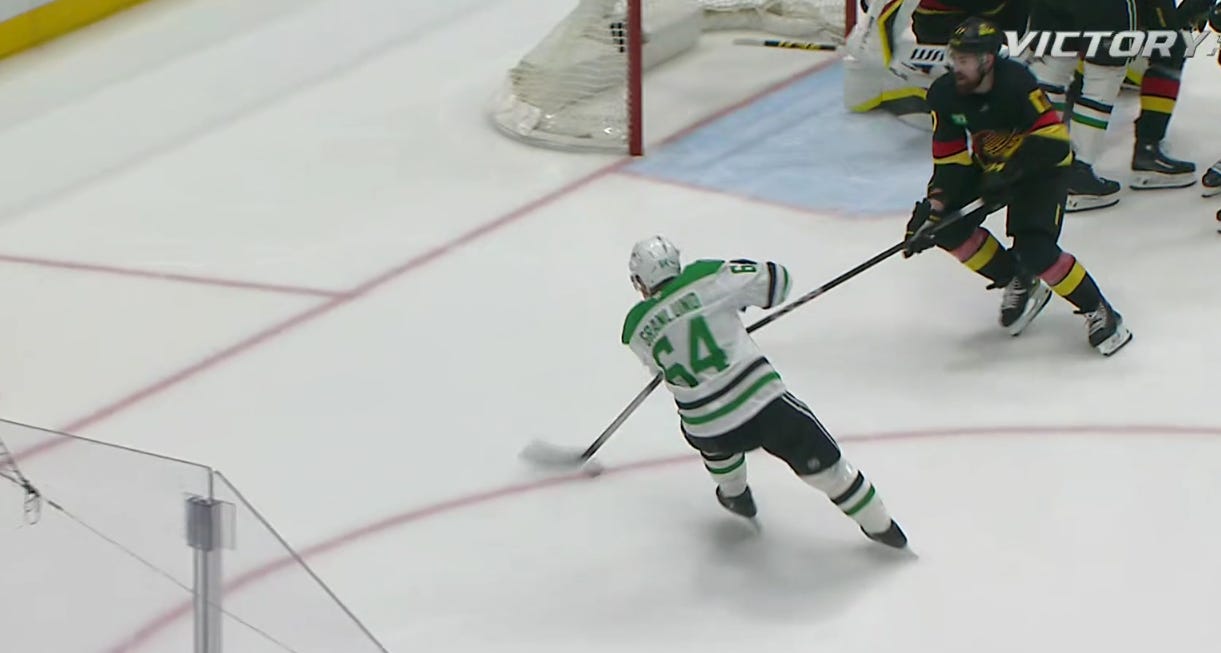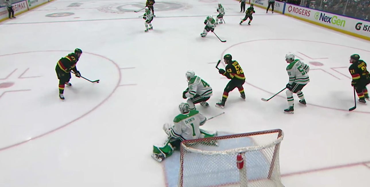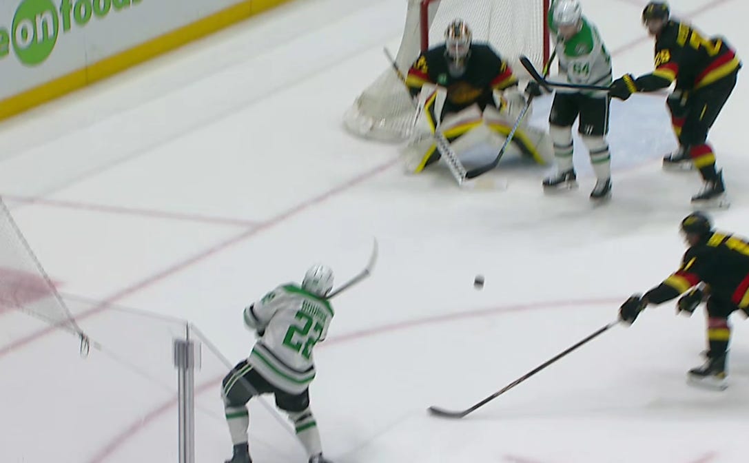 A scramble at the netfront indicated Vancouver’s pushback, and the Stars had to hunker down for a couple of minutes to weather the storm. They ended up generating a chance of their own just after the halfway mark, as Rantanen fed Robertson from the boards with Lian Bichsel rushing in alongside him. Robertson set up the defenseman for a great shot that got through Lankinen, but the puck trickled just wide of the post and behind the goal line.