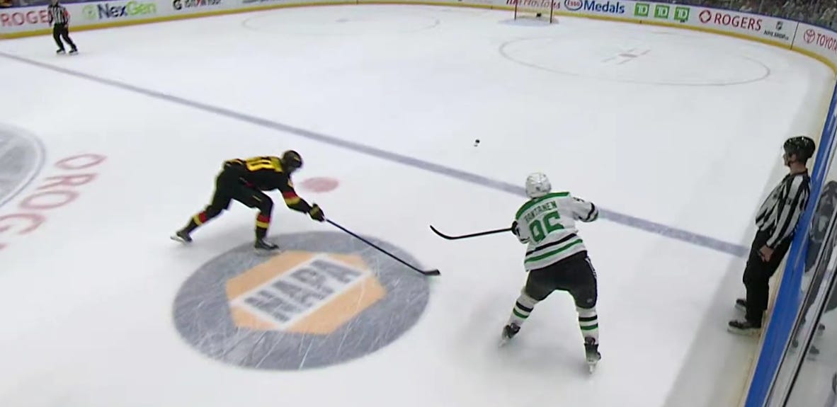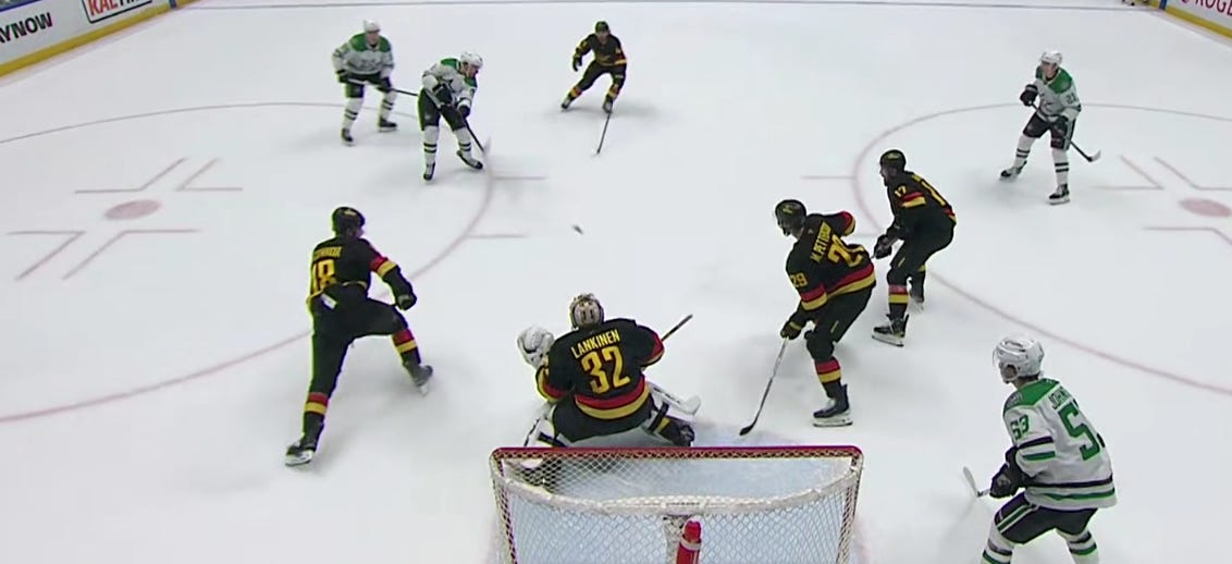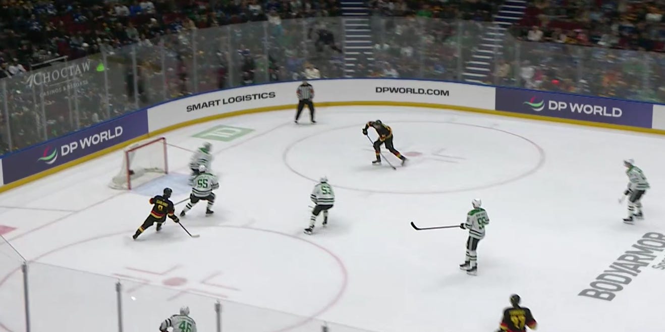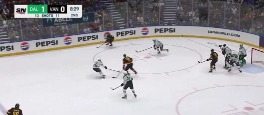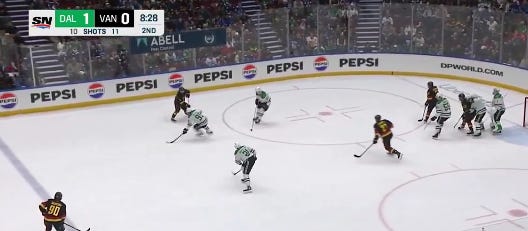 The Canucks successfully pulled the Stars’ forwards out of position and Forbort’s move got Vancouver numbers at the hashmarks—a sure sign of blown coverage, as one of Rantanen and Duchene probably needs to pick up Forbort (in the middle of the ice here, heading to the weak side) and he dishes the puck to Mancini in the image below: