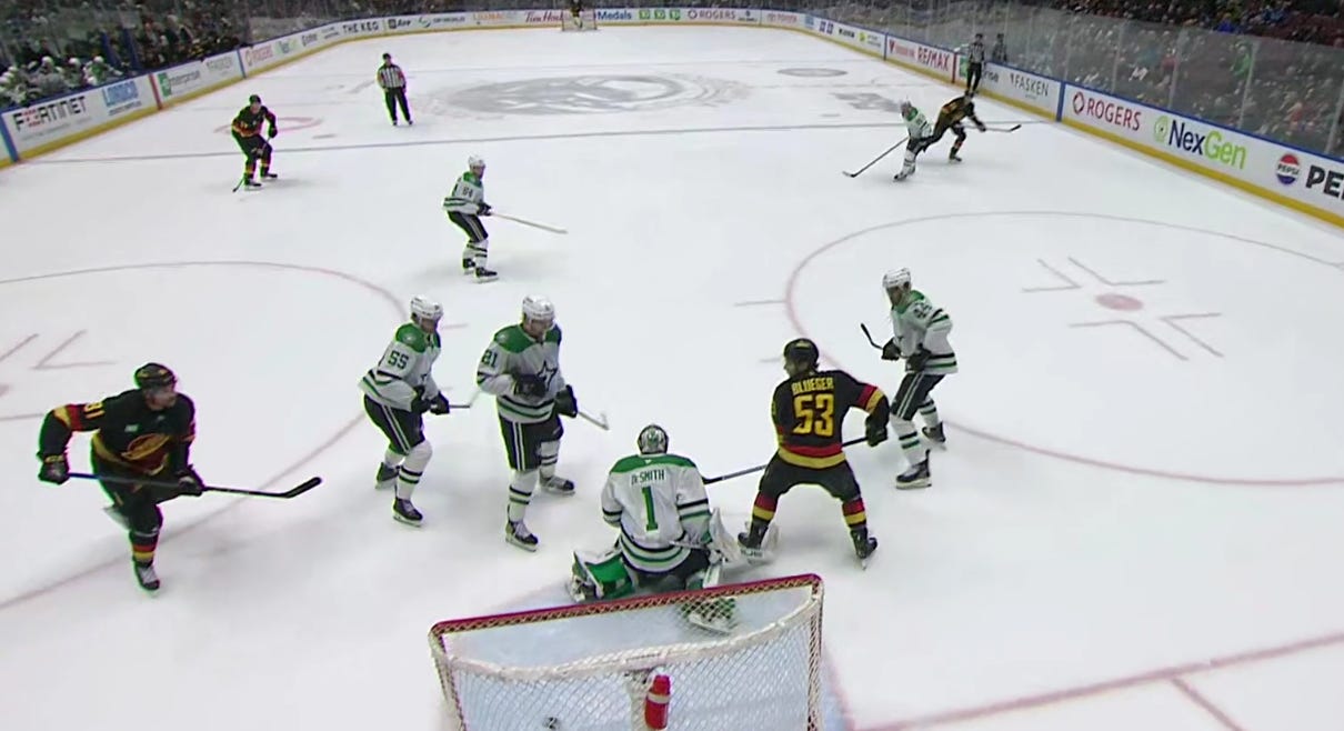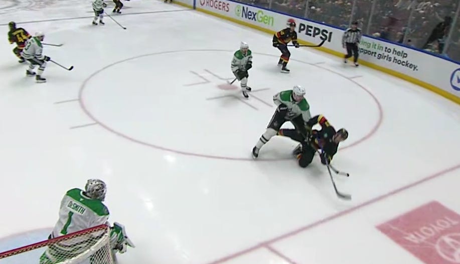 The Stars’ defensive work in this one was noticeable in the way that Vancouver generated a lot of scrambles around the net, but they couldn’t find loose pucks quickly enough, which is as much a credit to Dallas’s desperation as a criticism of Vancouver’s killer instinct. Dallas’s forwards (especially their fourth line, with Blackwell re-inserted) were largely following Robertson’s lead, and it made life easier on everyone as a result, including Casey DeSmith.