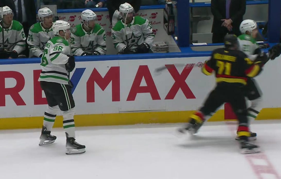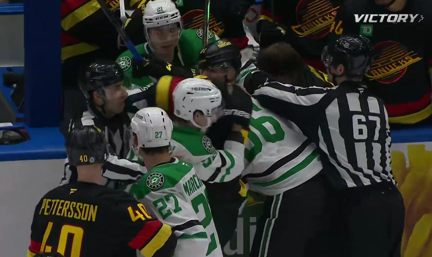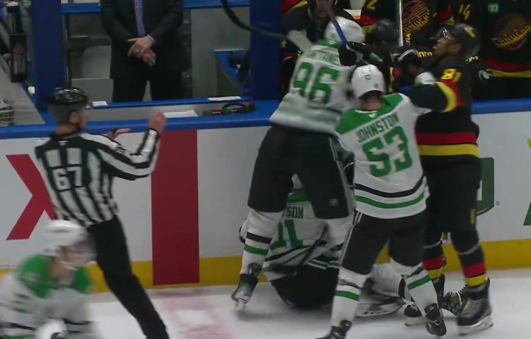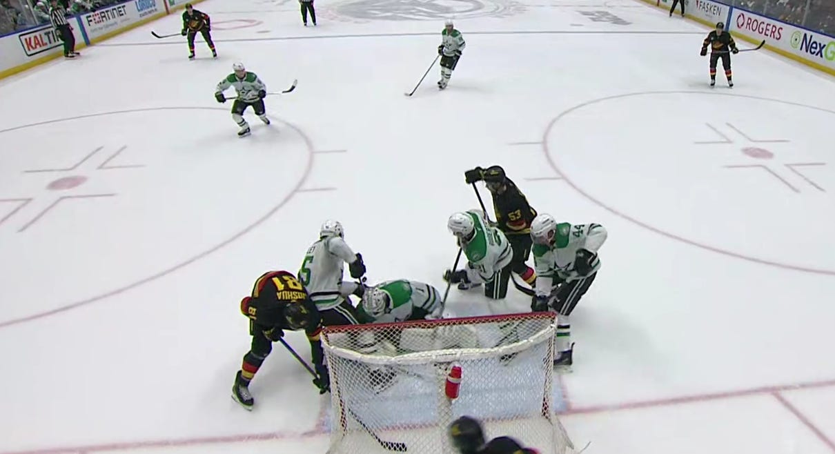 It all resulted in a big ol’ scrum, out of which the officials agreed that Höglander had been running around like a bit of a nincompoop, so Vancouver probably deserved to be punished, sending Rick Tocchet into the stratosphere when he realized his team was going to be shorthanded. Dakota Joshua was given an extra minor, and that gave the Stars a chance to spend another two minutes not scoring on the power play, which they promptly took, and did. All’s well that ends well, Rick.