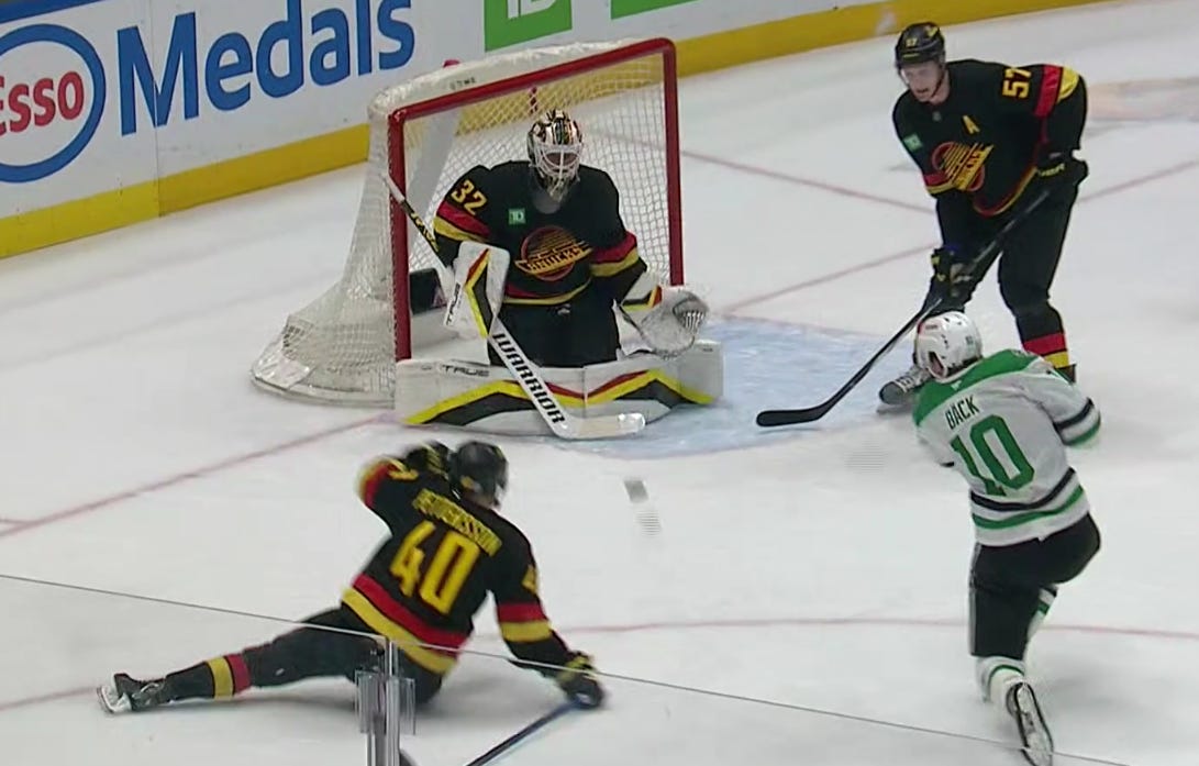 Oskar Bäck got the Stars’ next great look, firing a puck into a Vancouver shinpad, then gathering the puck and firing again into Kevin Lankinen, who swallowed it up.