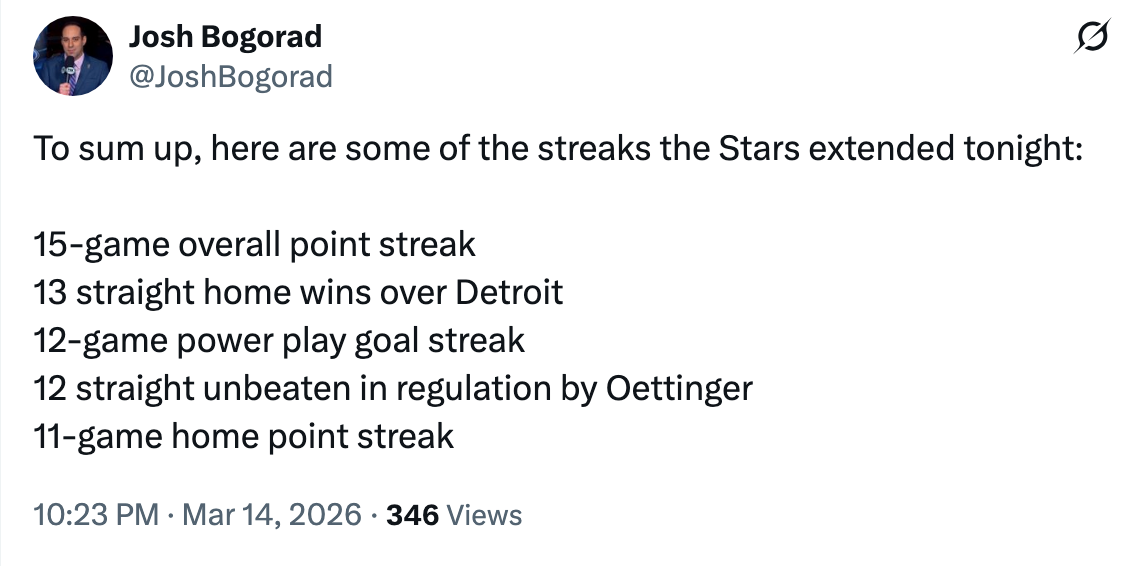 This tweet from Josh really sums it up, I think. The Stars are rolling at an unfathomable level. If you’re not taking time to enjoy it, what are you waiting for?