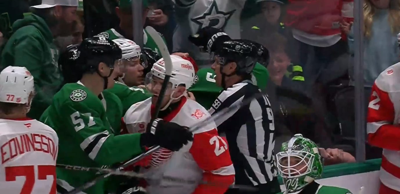 Lian Bichsel and Marco Kasper got into it after the whistle with 15 seconds to go in the second period,and everyone jumped into the pile. Dallas is getting lots of good practice lately for what the playoffs are going to be like after whistles.