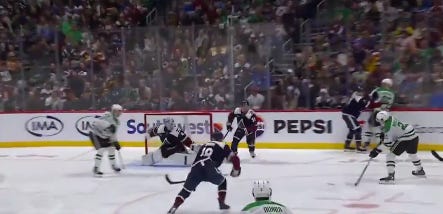 Colorado’s first line got a good shift in on the Stars’ fourth line with about five minutes to go in the second, hemming them in for nearly a minute along with Harley and Lyubushkin. The Stars survived, but once again, the second line for Colorado would punish them a minute later.