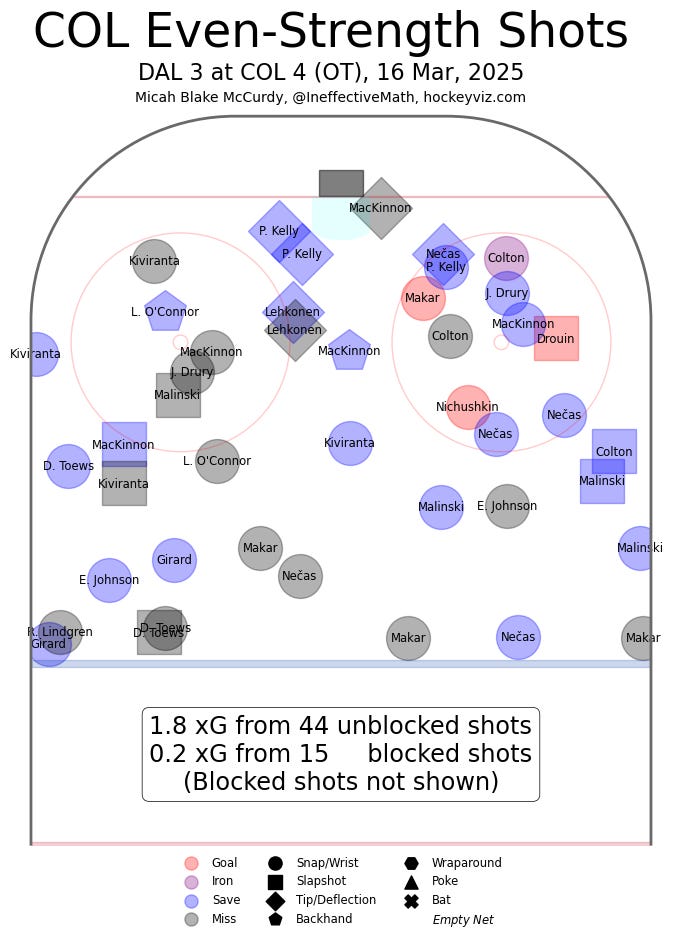 In fact, if you want to take Natural Stat Trick’s numbers, the Stars actually had a 10-8 edge in high-danger shots on goal at 5-on-5. Context is so important when looking at giant numbers of shots on goal, and you can see how Dallas’s fewer shots were more densely concentrated in the slot, whereas Colorado was firing pucks from everywhere.
