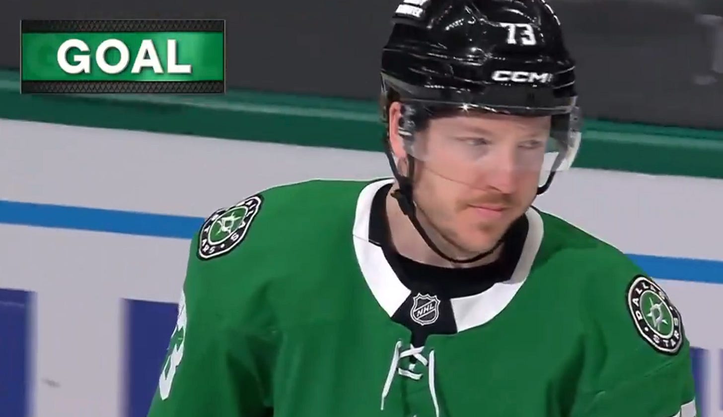Jamie Benn would find Steel a couple shifts later, when he fed Steel with a pass from behind the goal line on his second try in short succession, and Steel did the rest: