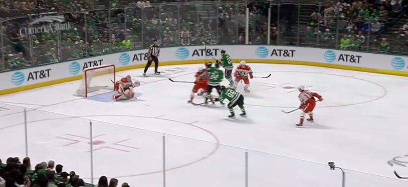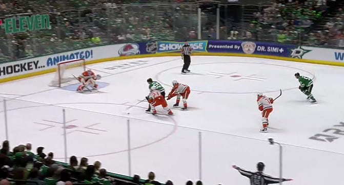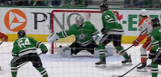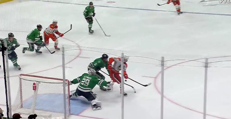 Matt Duchene then atoned for his earlier penalty in one of the two ways a player can atone for a penalty, which is to say he drew a tripping call on Olen Zellweger. And from there, the Dallas power play went to work, with none other than Wyatt Johnston in front of the net to perfectly draw a Harley wrister from the point back on net around the blocker.