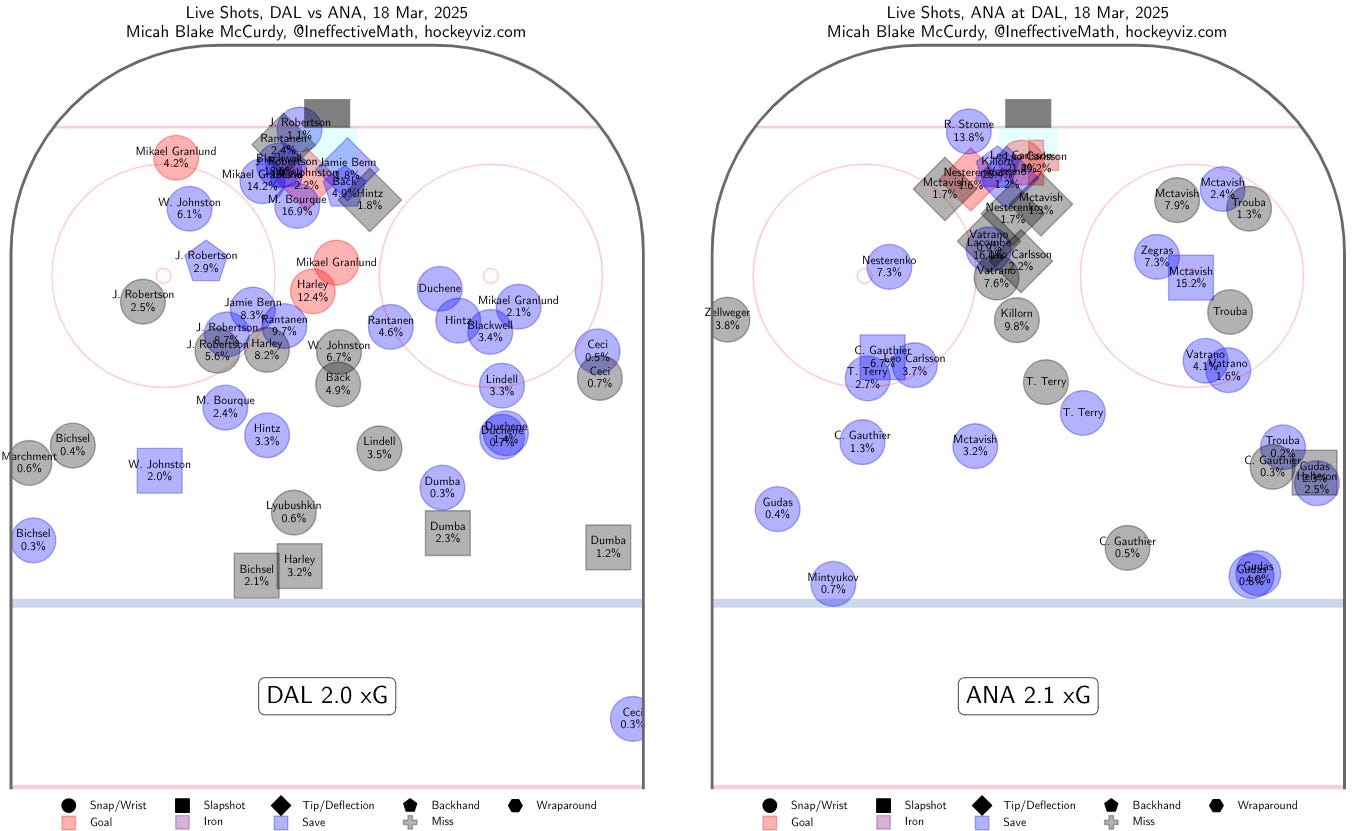 Dallas racked up more shots than Anaheim, ending the night with a 31-25 advantage in shots on goal. But Anaheim also missed the net on some good looks, while Dallas didn’t capitalize on some great rushes.