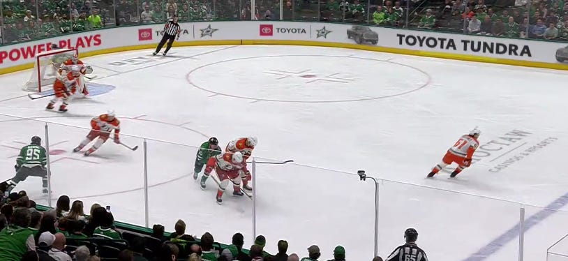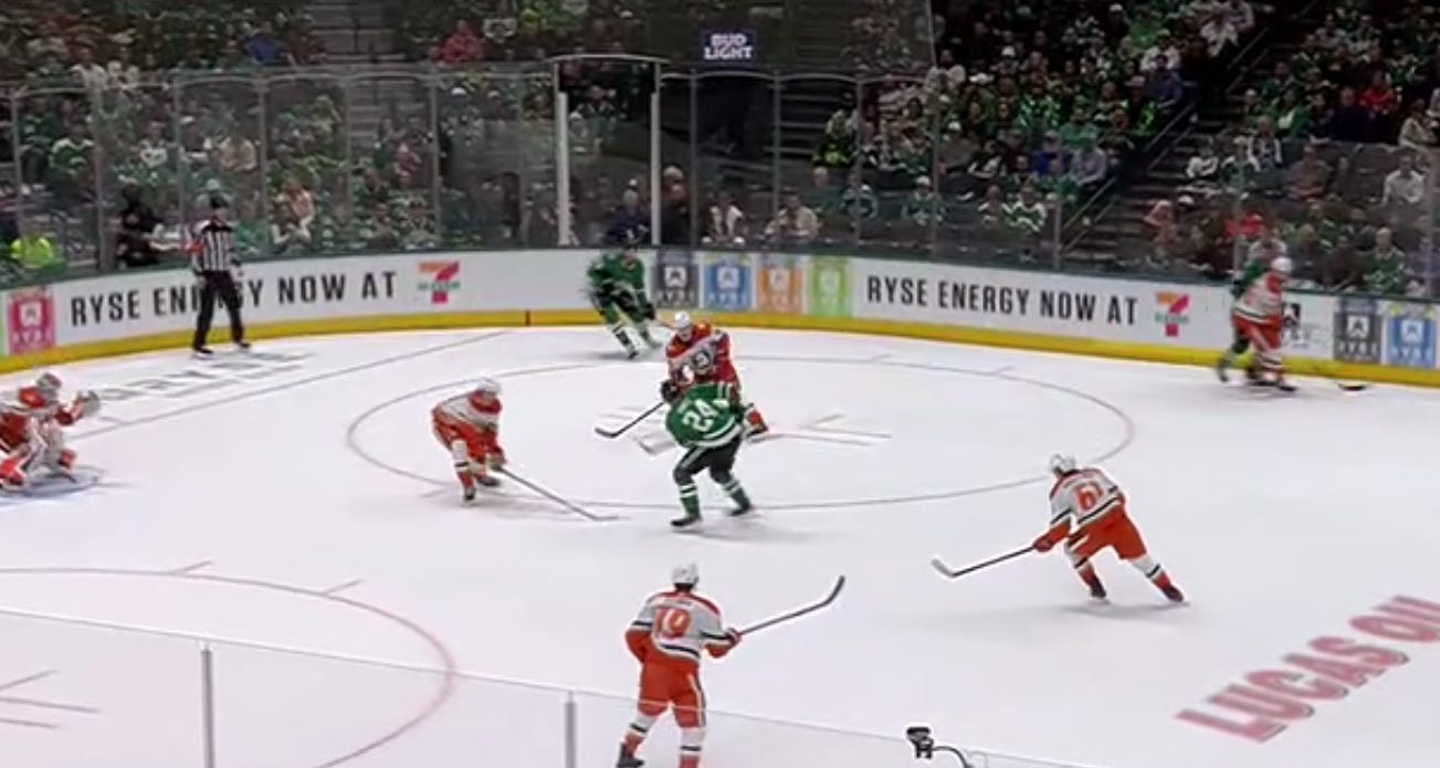 Dallas got two more great chances right after that, but Hintz once again opted to pass on a 2-on-1, but the puck didn’t get through. Then Colin Blackwell made a great movie to start a rush attack that led to sustained pressure from the Stars’ fourth line, eventually drawing a penalty on Mason McTavish for hooking Sam Steel.