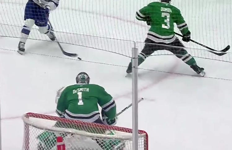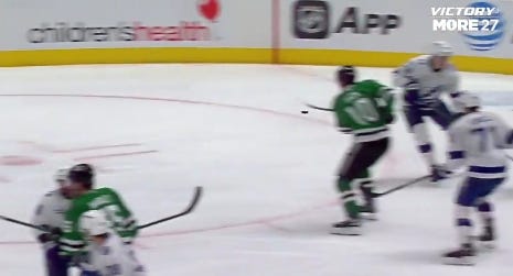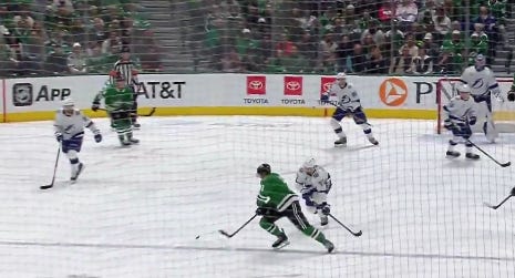That would not be the case when the Stars’ top line turned a puck over int he offensive zone, allowing Tampa Bay to rush back up the ice 4-on-2. Matt Dumba and Lian Bichsel weren’t able to cover all of the (many) passing lanes available, and Brandon Hagel eventually got a dunk on the back door that DeSmith never had a chance on to make it 1-0.