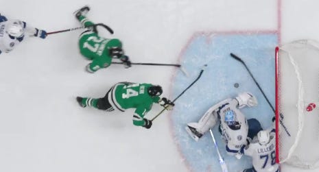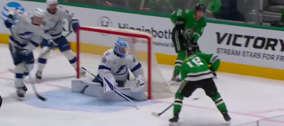 But that second goal seemed to wake up Dallas up for real life, as they finally leaned on Tampa and got a result. DeBoer put the fourth line out for the ensuing faceoff, and after circling the zone, Colin Blackwell threw a fadeaway shot from the point that Oskar Bäck tipped through a crowd, including Vasilevskiy, to get Dallas on the board.