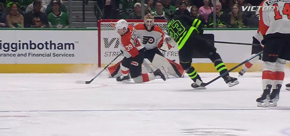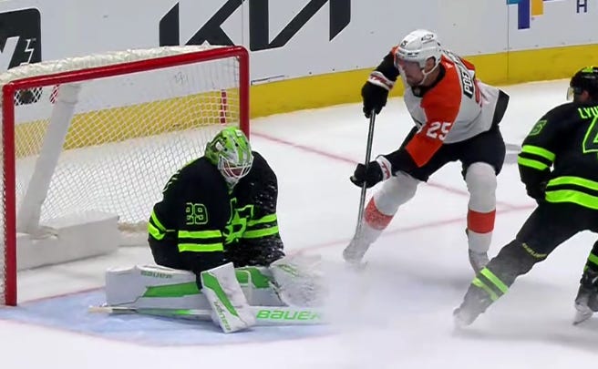 They did their best to give the Flyers chances, however, as Pelletier and Poehling both got gift-wrapped looks, only for one to end with a failed cross-crease pass, and the other getting blocked into the netting. Konecny also got a look from the same spot he scored a goal from after a stretch pass, but he put this one past Oettinger’s glove and into the crossbar, letting Dallas off the hook once again.