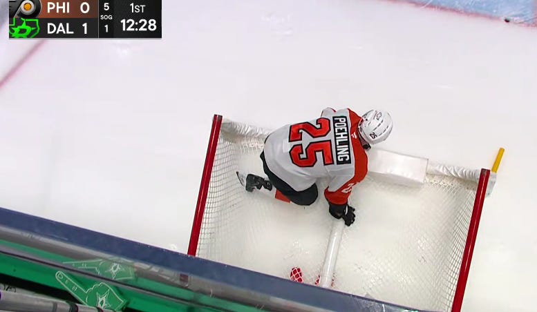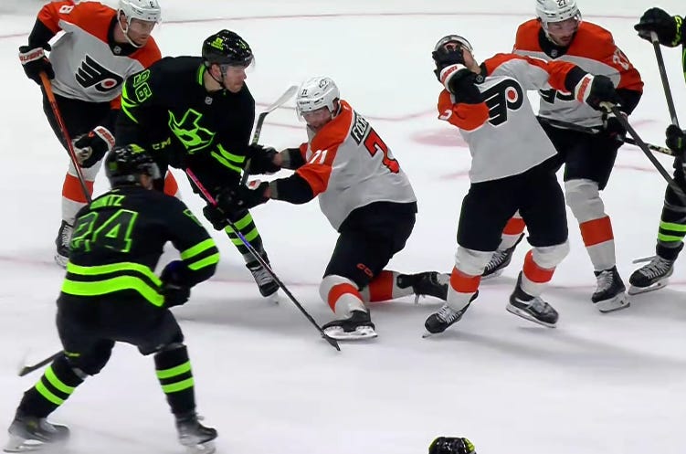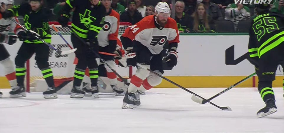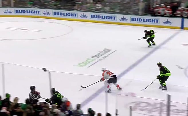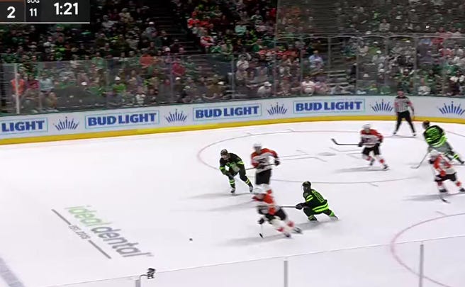 Philly turns the puck up ice here, and you can see the Stars appear to have numbers. They do not, it turns out.