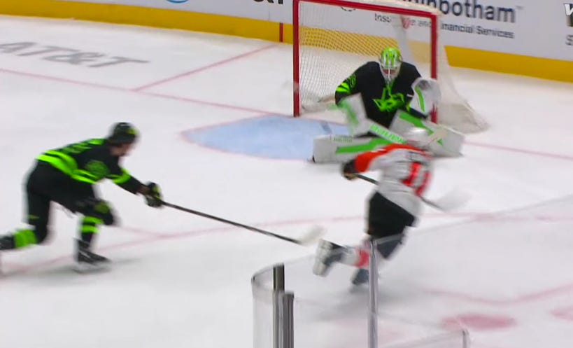 After killing that penalty despite a couple of failed clearances and Lyubushkin using Bäck’s stick in a moment of exigency, the game quickly turned into a tense affair, with Dallas on the precipice of falling behind to a bad team playing badly.