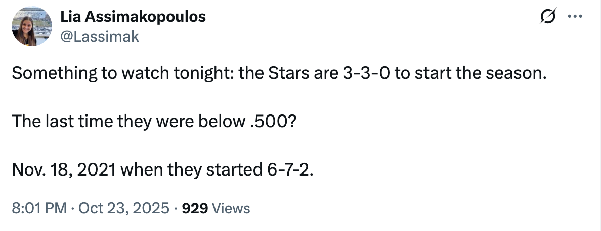 But that’s the thing: Jason Robertson and Wyatt Johnston had genuinely outstanding games, and really, so did the team in general. It’s early enough to where it really does feel like the Stars have the option of treating this game as negative motivation or positive, and one suspects that it’ll be easier to choose the latter after getting a bit of shut-eye. Some nights are best slept off and forgotten about anyway.