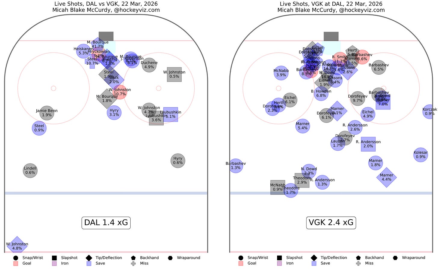 That’s just not enough offense, no matter how you slice it. Dallas found themselves trading chances early, and then outright ceding chances for much of the second period, as Vegas began to grab control.