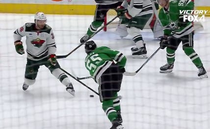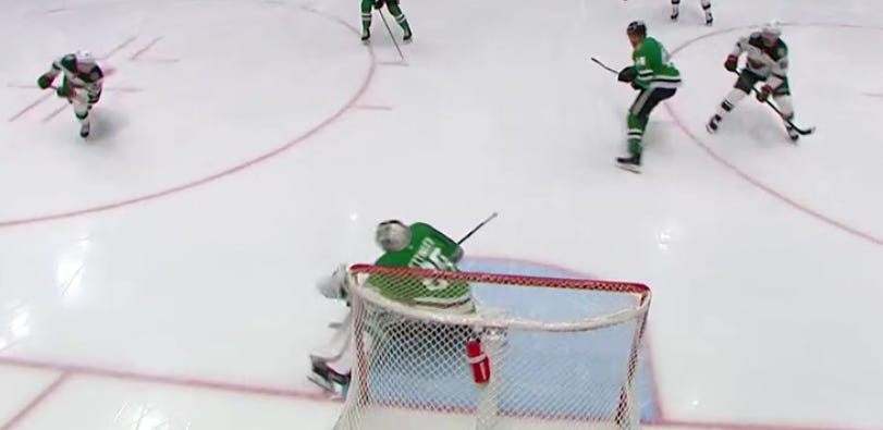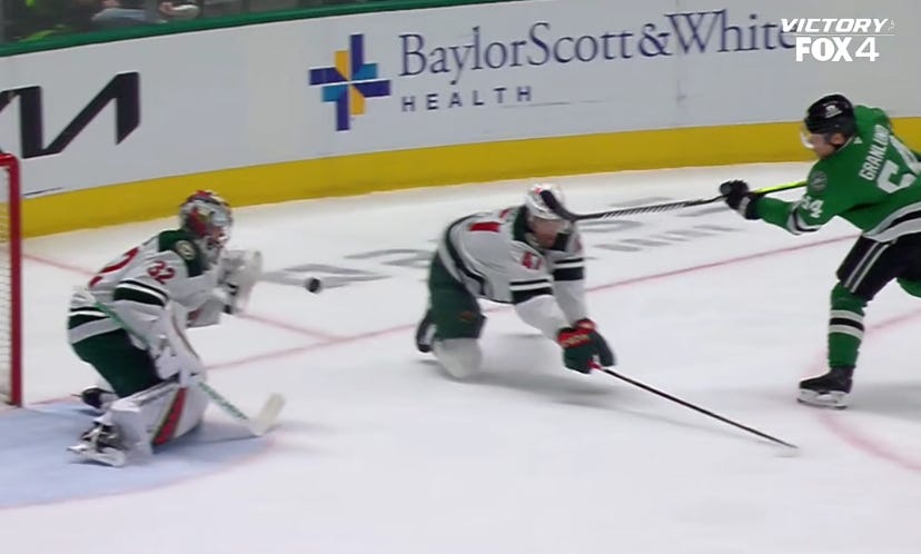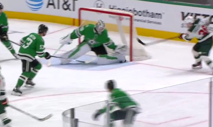 When Oettinger is on like he was in this game, it’s hard to beat him without a serious defensive breakdown. But Dallas obliged with two of those right afterwards on a couple of failed clearances, only for Gus Nyquist to send a 2-on-1 chance far outside of the 4x6 frame, and for another shot for Minnesota off a failed zone exit to get blocked into the netting.