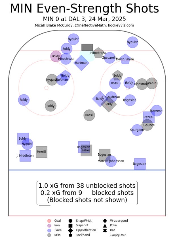 Brock Faber had to play 30 minutes, and old friend Devin Shore is probably not one of Jon Hynes’s first choices to play in his starting lineup against the Stars. Minnesota is decimated by injuries (they didn’t have Jonas Brodin tonight either) and hamstrung by the Suter and Parise buyouts, so it’s impressive they’re still able to make games as tough as this one was. They lost Declan Chisholm to a blocked shot as well.