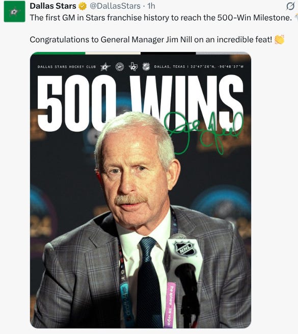 Jim Nill saw the Stars earn their 500th win during his tenure tonight, and I don’t think you can say anything that hasn’t already been said about what this team has become under his leadership. There have been bumps in the road, as always. His first five years saw Lindy Ruff and Ken Hitchcock’s teams make the playoffs in just two of five seasons. But his next seven have been nothing short of a gift for Stars fans.