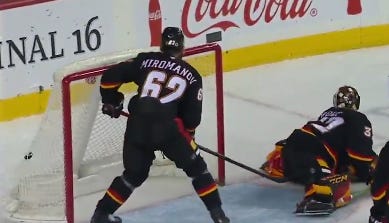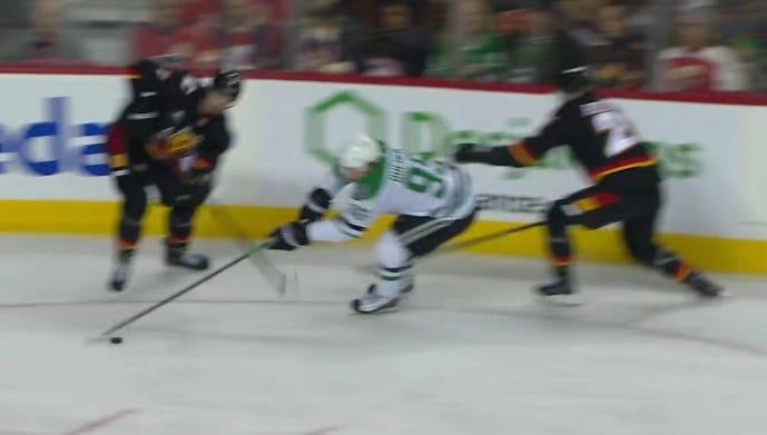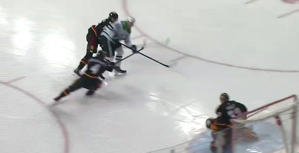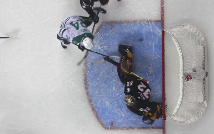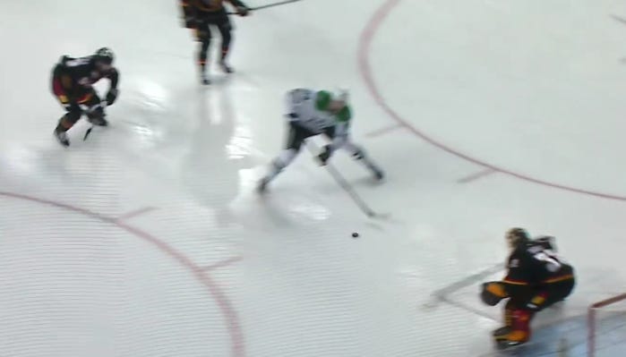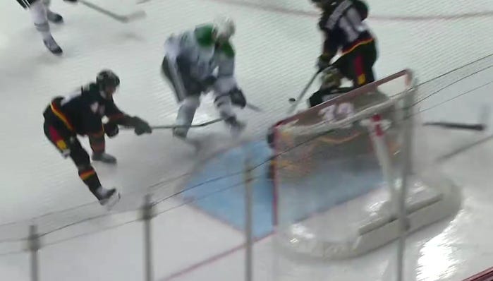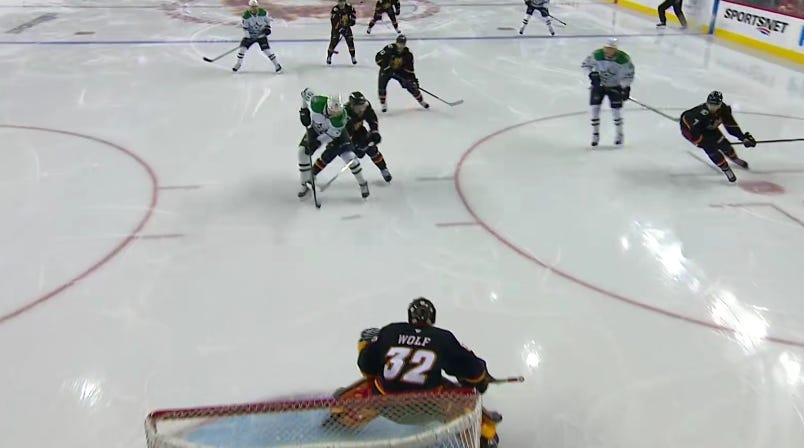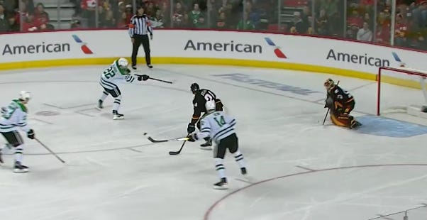The Stars made it through the kill with a couple of other tip attempts by Calgary going just wide. And after some near-misses by the Flames, Dallas finally got a shot on goal when the top line went the other way with numbers, and Robertson slipped a perfect backhand in for Hintz, who Wolf foiled while attempting a poke check you can see him winding up for below.