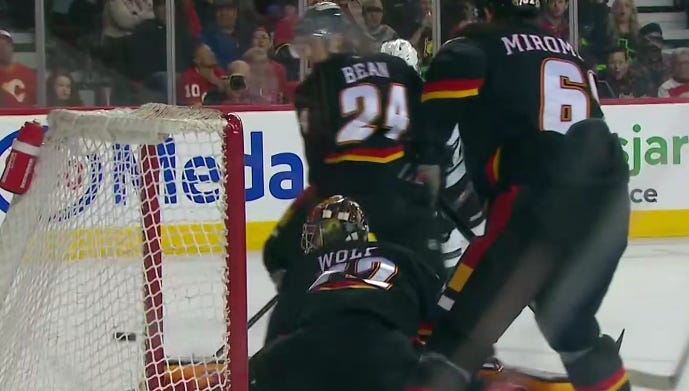 (That’s Johnston’s helmet peeking out above Jake Bean’s shoulder there, having just dished the puck over Wolf’s pad and into the net.)