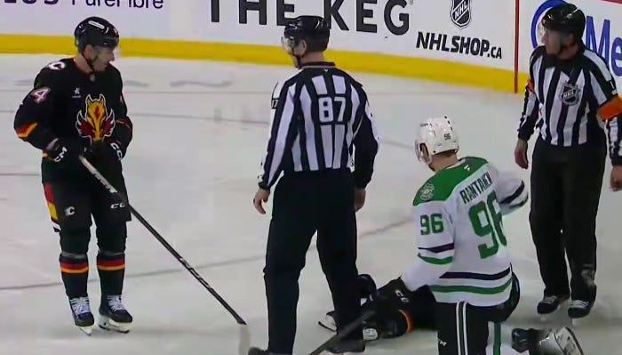 Rantanen was clearly apologetic, but the Flames were apoplectic, as they had a 3-on-2 rush whistled down with Zary clearly in agony back up the ice. He left, and would not return.