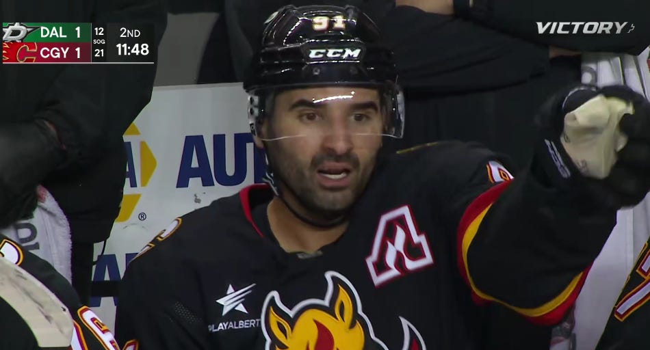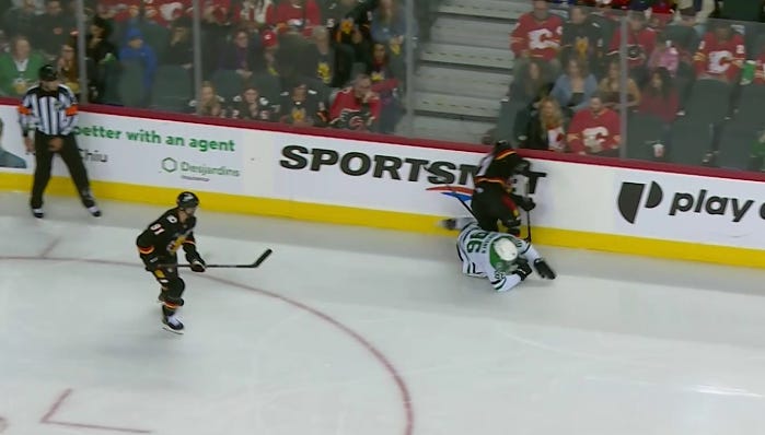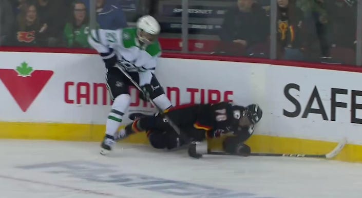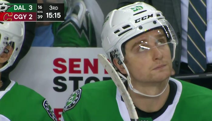 For just a moment, spare a thought for Calgary fans, who watched their team fire pucks at Casey DeSmith all night long. They lost Connor Zary to a nasty injury after Mikko Rantanen fell along the boards and slid into his knees. They had two goals called back for kicking and for goalie interfering(ing). And they racked up 15 shots on goal in the third period before Dallas registered one—only for the Stars to immediately score on their first chance of the period to restore a two-goal lead.