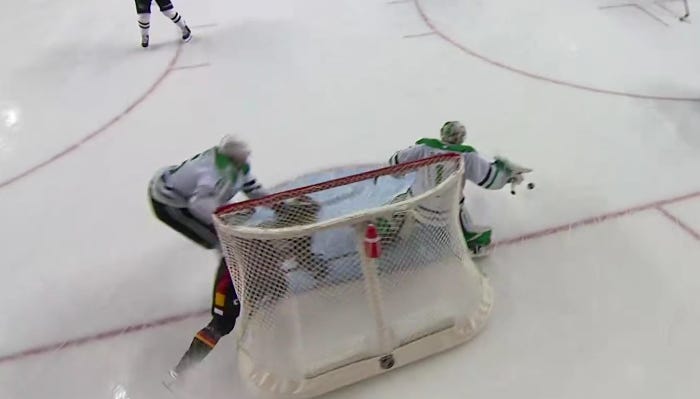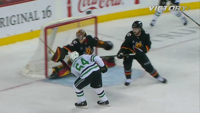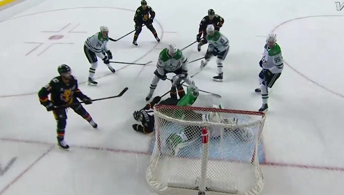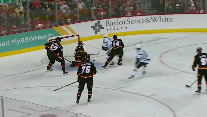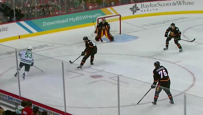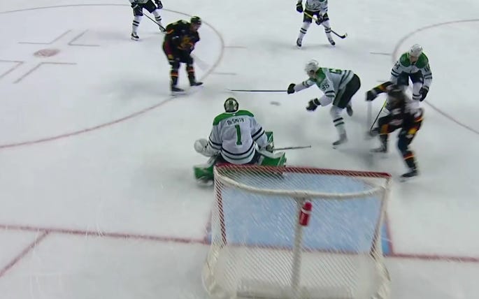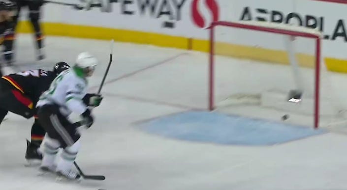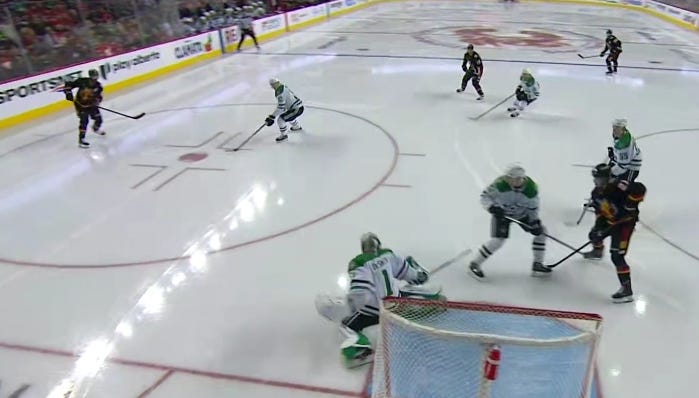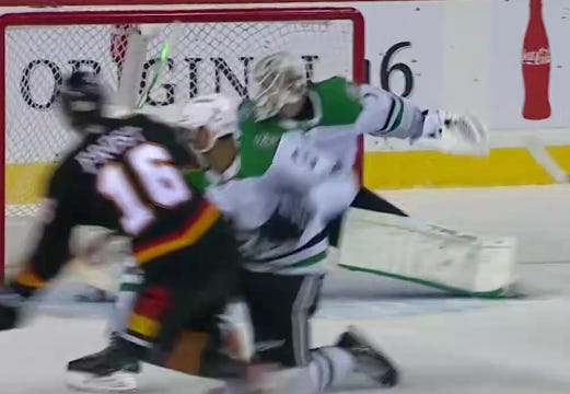 And after getting space to work with, the Stars nearly let the Flames tie it back up after Connor Zary beat Lindell to the crease and got a piece of a cross before bonking into DeSmith, allowing the puck to slide in at the near post.