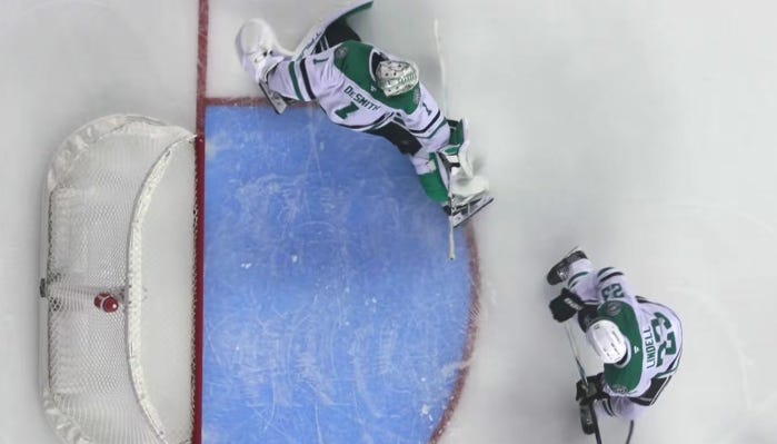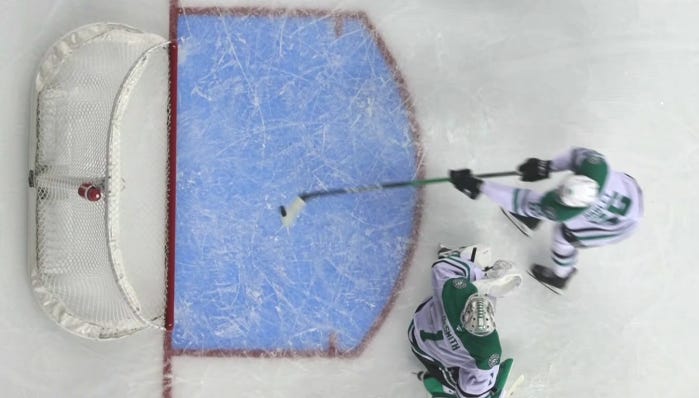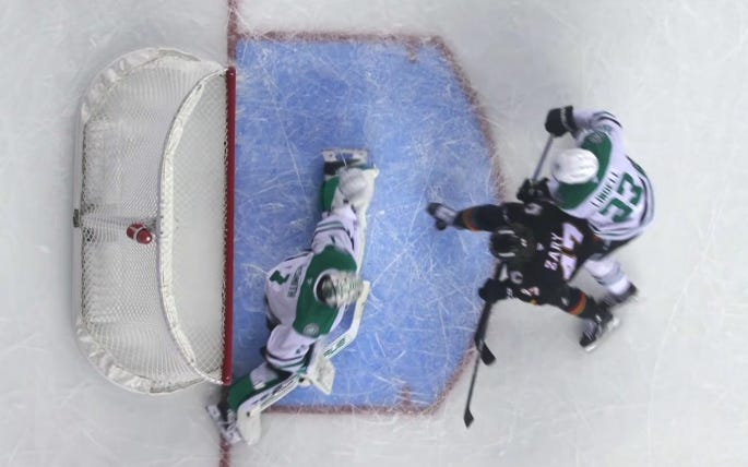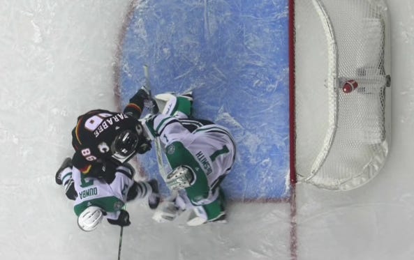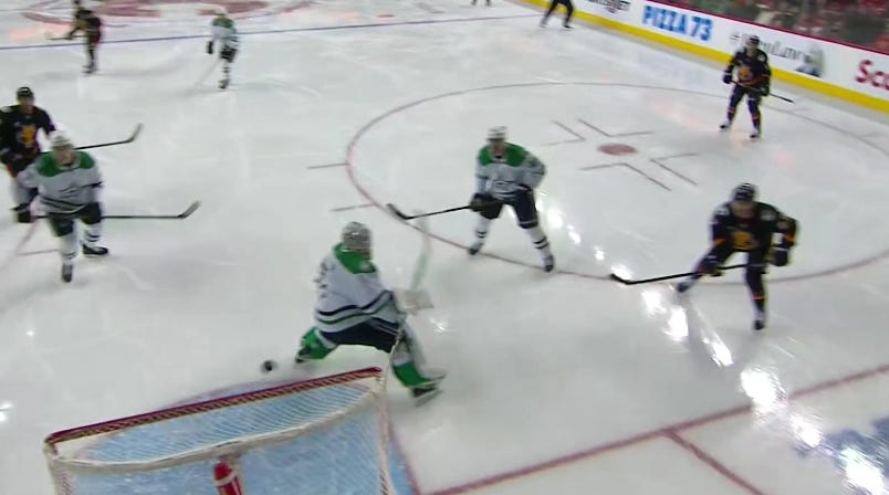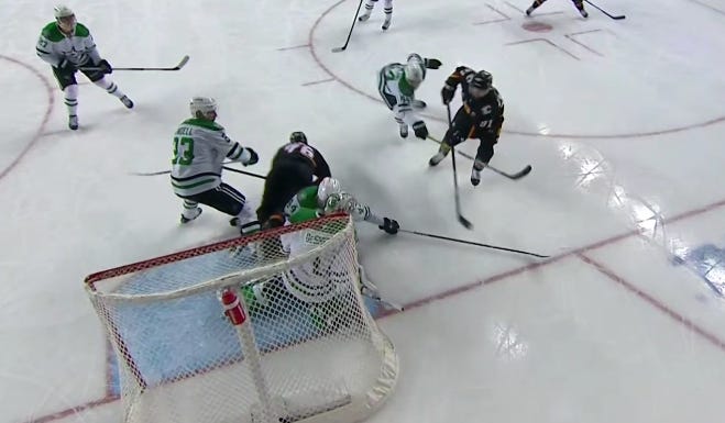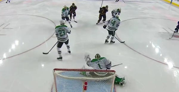 Anyway, the Stars killed the penalty despite some dangerous pucks that rebounded into and around the crease, such as this slapshot that bounced off the back boards, onto the crossbar, and away from the net.