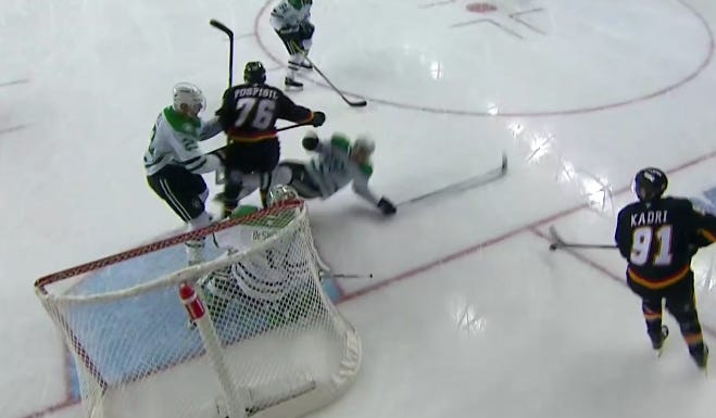 But eight minutes into the second period, the Flames would get the equalizer when Nazem Kadri roofed a puck like he was trying to impresse Auston Matthews. Both Stars defensemen (including Cody Ceci, who would have otherwise been the one to mark Kadri) got tangled up with Pospisil just in front of DeSmith, but there was no contact with the goaltender, so this tally stood. Thus, after putting the puck in the net for the third time, the Flames finally got one to count. 1-1.