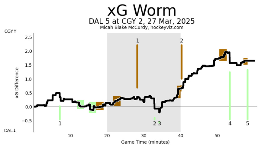 So, of course, the Stars promptly quintupled down in Calgary, setting new season “highs” with 48 shots on goal allowed and over five expected goals against, all with Dallas blocking 32 shots throughout the game. Calgary even set a franchise record for shot attempts in the game, only to lose 5-2.