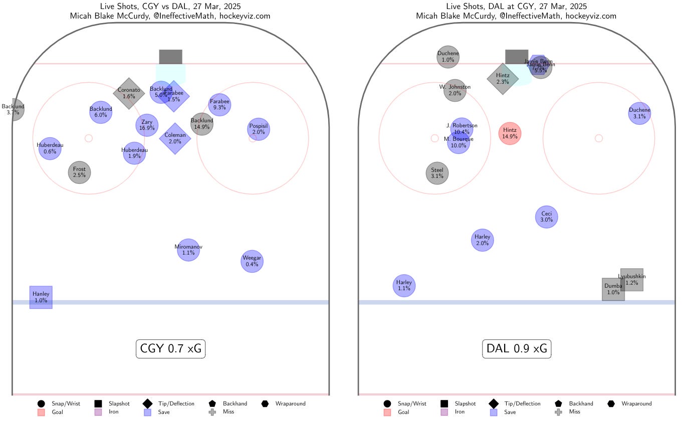 Usually I don’t care about shot totals, much less shot attempts. Corsi is highly misleading. But tonight, it was a consequence of the Flames dominating possession in all three zones. But they also got the full Casey DeSmith experience, and they don’t have the top end scoring talent that the Stars have.