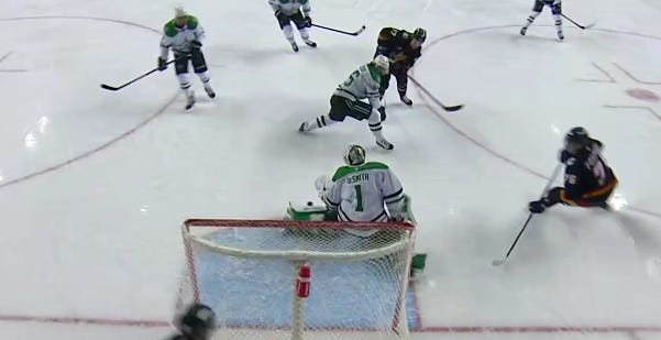 On the ensuing minute of the power play, Matt Coronato rang the crossbar after the Flames collapsed in on the Stars penalty kill, leading to a flailing DeSmith escaping the period with a 3-1 lead and a dented post.