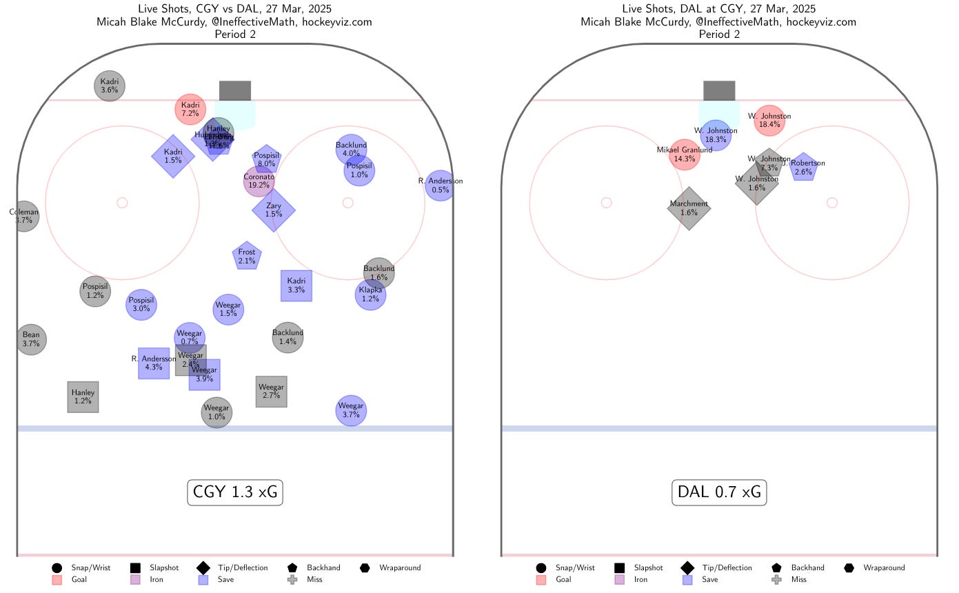 Anyway, the period ended almost entirely in Dallas’s zone, as Ilya Lyubushkin took a hooking penalty after an extended bit of pressure for Calgary led to an icing, after which Lyubushkin was caught reaching out and hooking Jonathan Huberdeau to stop another glorious Calgary chance with a minute to go in the second period.