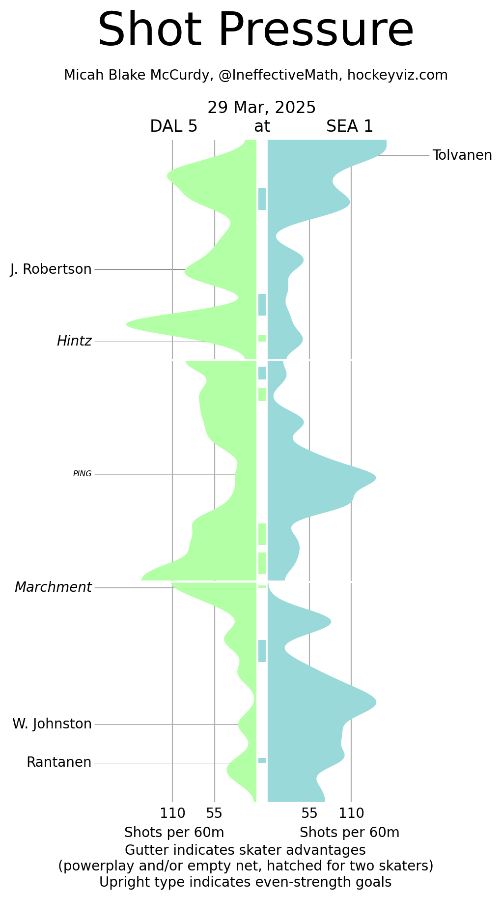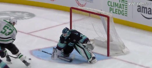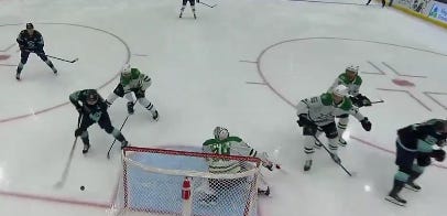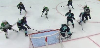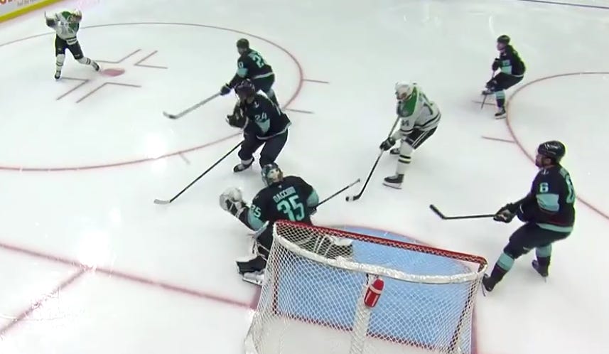 That power play was Dallas’s fourth, giving them a rare (in recent days) lead in special teams opportunities. But despite creating some chaos, they didn’t get a real high-grade shot on Daccord, and Seattle escaped without giving up what would have been a really demoralizing (for them) goal late in the second period.