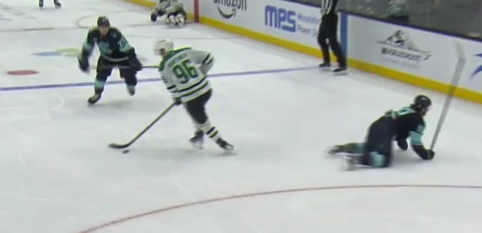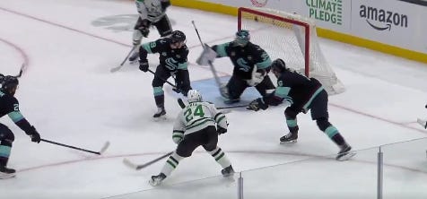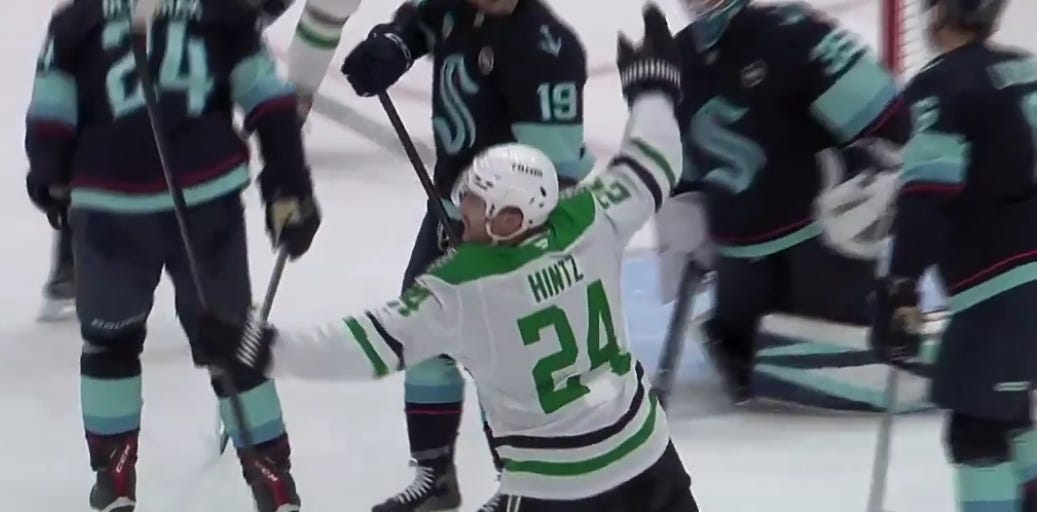 Roope Hintz turned down a glorious chance after the top line’s latest successful traversal of the ice, with Rantanen finding Hintz crossing the top of the crease all alone—only for Hintz to feed the puck back toward the back post into a crowd of Kraken, with no Star in sight. It’s not the first time in recent days that Hintz has looked for the knockout pass after getting a good luck, but hoo boy, that’s a puck he’ll wish he’d just shot when he watches it back later.