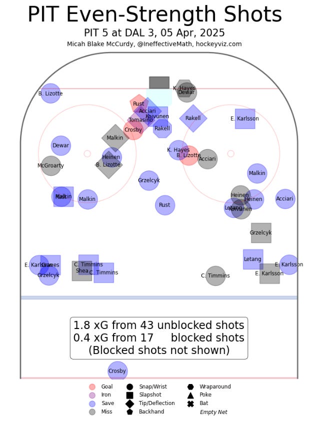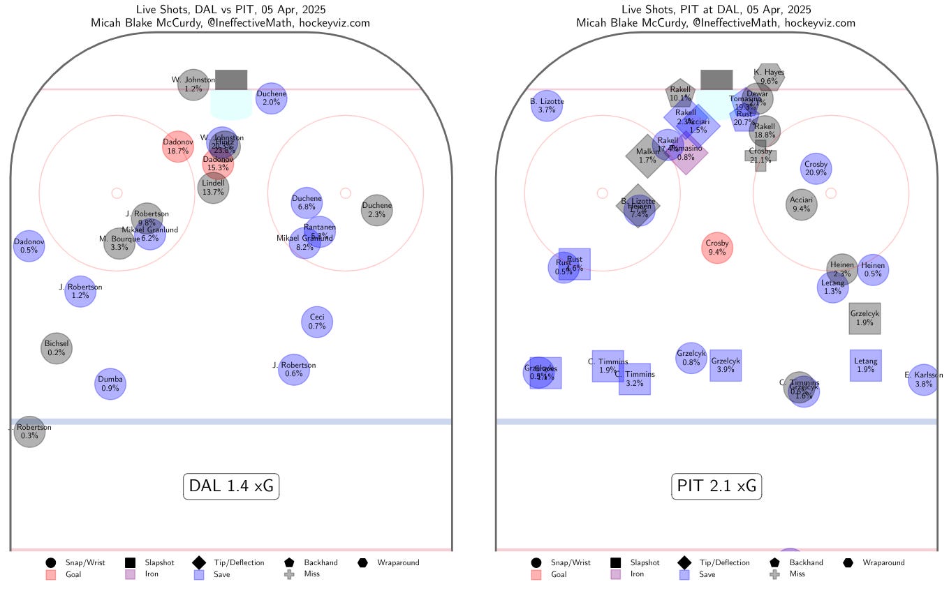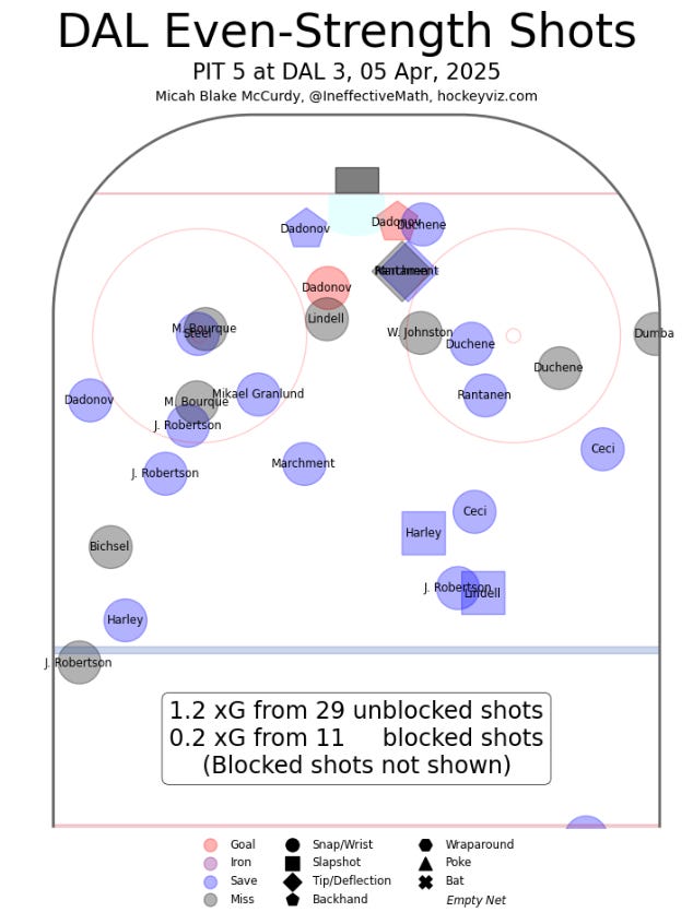 After 20 minutes, Pittsburgh had a 12-8 edge in shots on goal, continuing Dallas’s recent (though increasingly common) trend of ceding 10+ shots on goal in the first period while not really being punished for doing so.