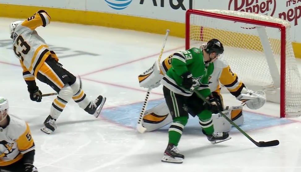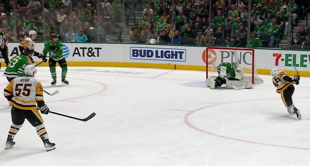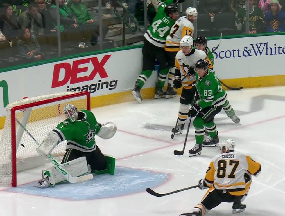 The Stars would wake up, if a rude awakening counts as such. The Penguins threw out the Crosby line to start, and Cody Ceci won a race the puck behind the net, only to have his backhand pass go right to McGroarty, who passed it right past Dadonov to an open Sidney Crosby, who scored a goal Sidney Crosby will score against any goalie in the league.