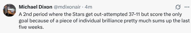 But after winning seven in a row, dropping this one felt needlessly disappointing. Dallas have raised the bar in the last couple of years, and even in the last few months. They had/have multiple franchise records and valuable goals to achieve with a win in this game. Instead, they put forth their latest incomplete effort against a struggling team 30 points below them in the standings.
