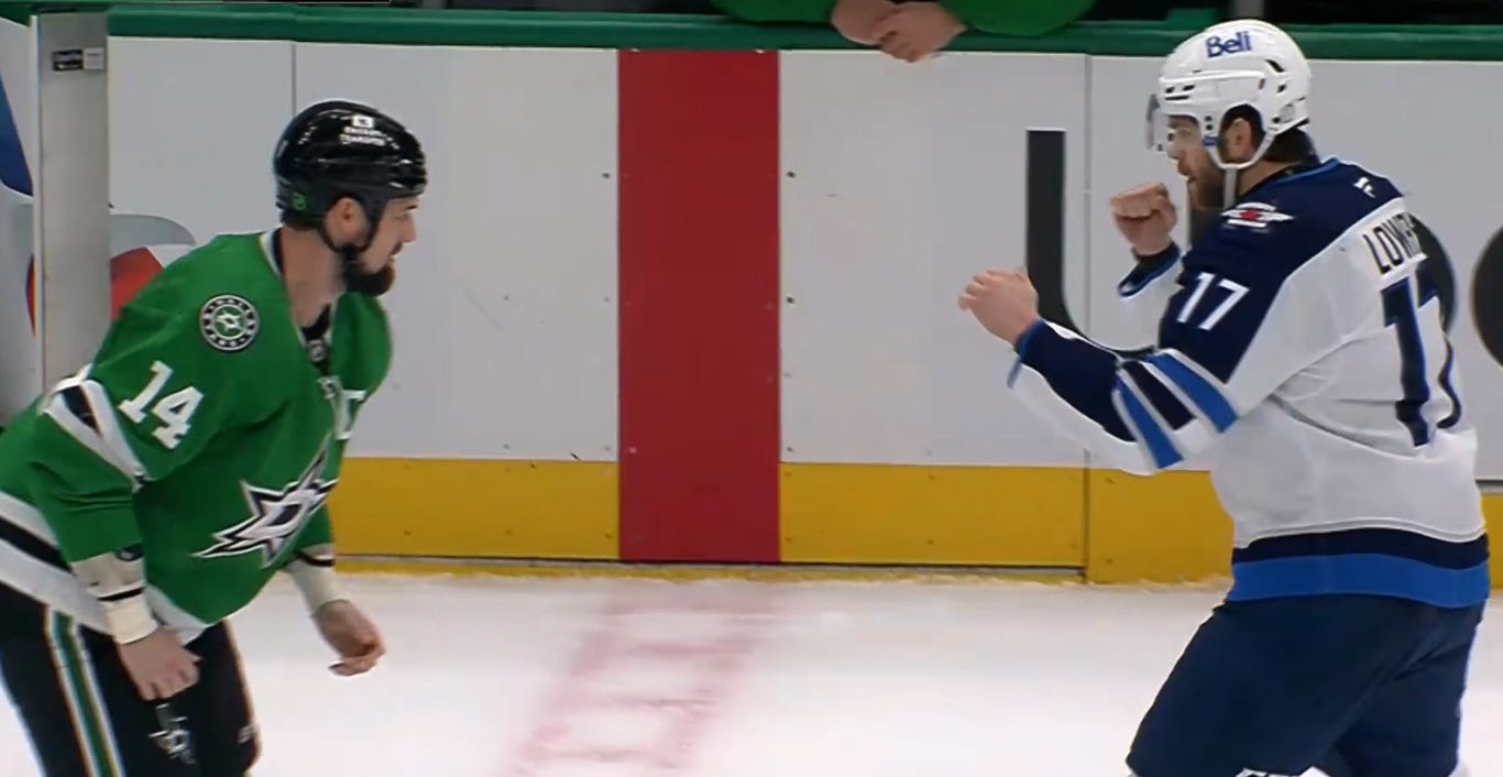 Jamie Benn and Adam Lowry would put an exclamation mark on the whole sequence by opting to settle the dispute with honor, and the two captains squared off for a fight.