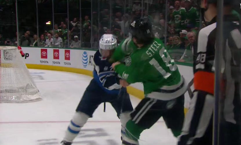 Sam Steel decided that Thursday nights are fight nights, and after he took a delayed holding penalty on Nik Ehlers, the pair mixed it up some more, and Steel threw a gloved punch that led to the bareknuckled sort right after.