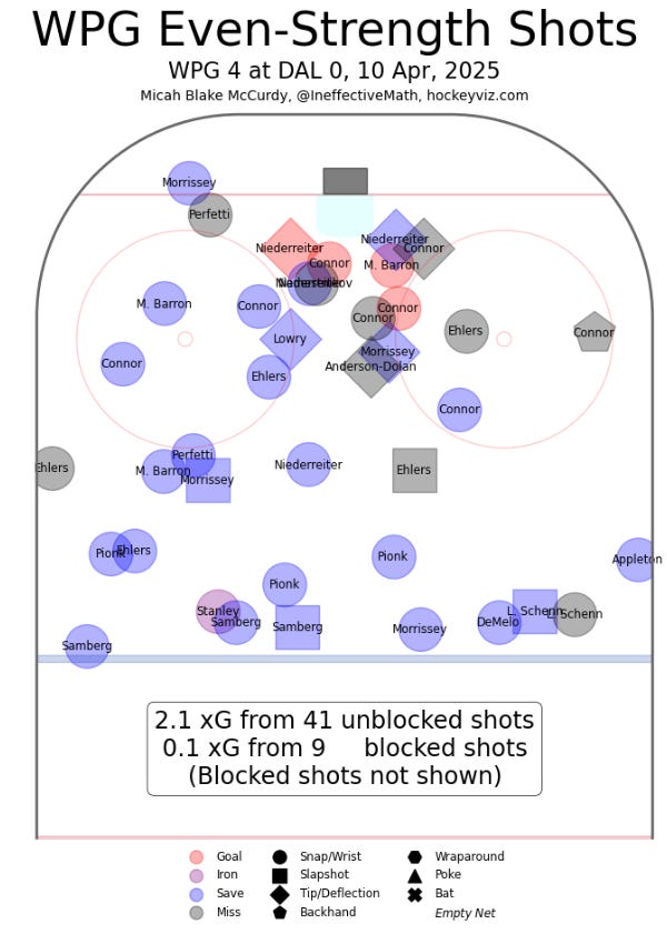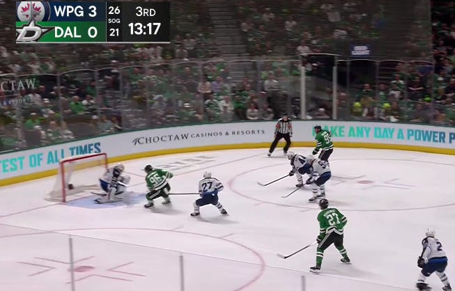 That’s a fabulous defensive job by Winnipeg against one of the highest-scoring teams in the league, which Dallas is. And while this game shifted radically in the third once Dallas had to start pressing for offense to get back in the game, it’s not entirely false to point out that the Jets just got better looks than Dallas did, and cashed them in more effectively, too.